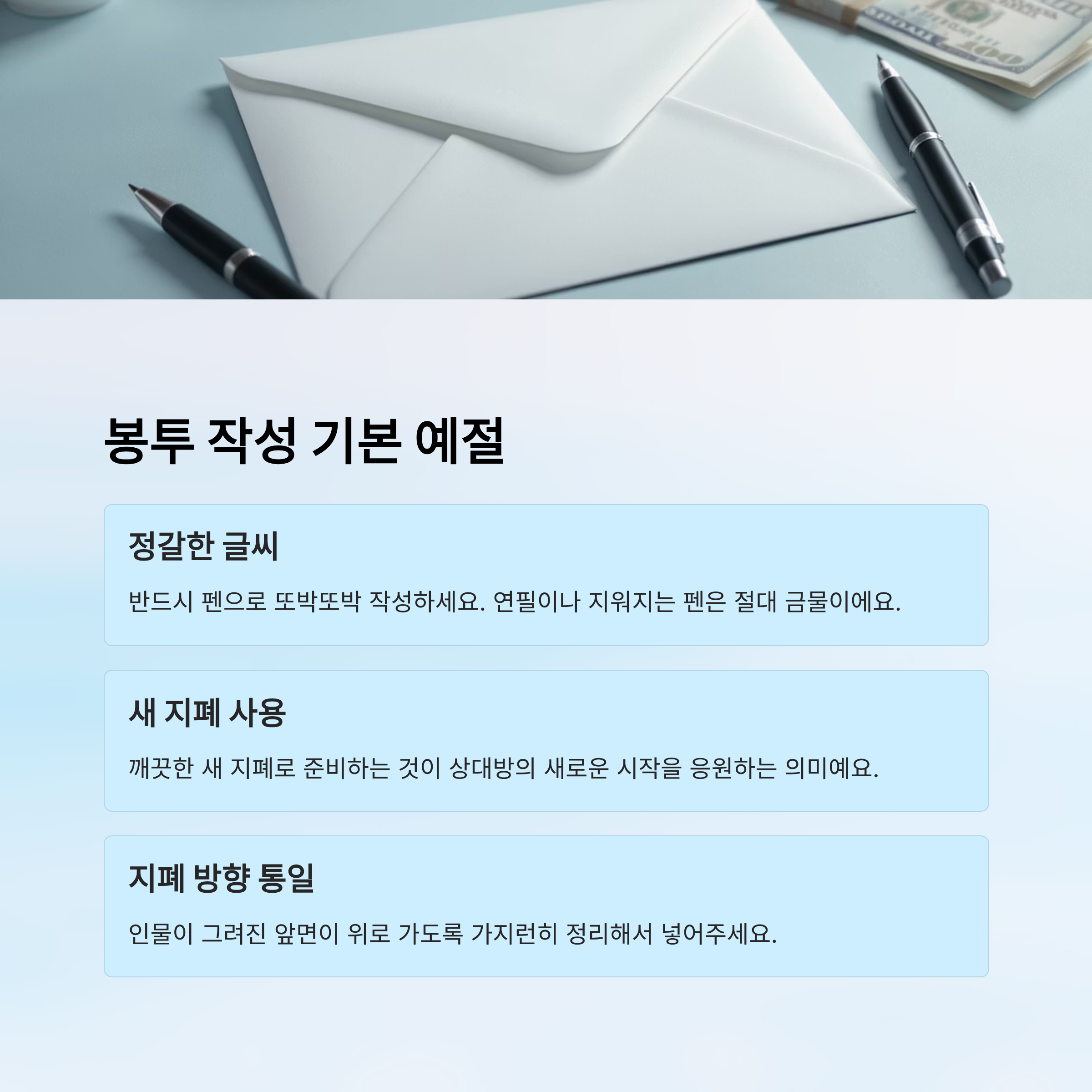 셋째, 돈을 넣는 방향도 중요해요. 일반적으로 인물이 그려진 앞면이 위로 가도록 해서 정리해 넣는 게 좋아요. 지폐 방향이 뒤죽박죽이면 받는 사람이 정리하기 불편하고, 자칫 대충 준비했다는 인상을 줄 수 있어요. 세심한 부분이 상대방에게 큰 차이를 만들죠. 💡