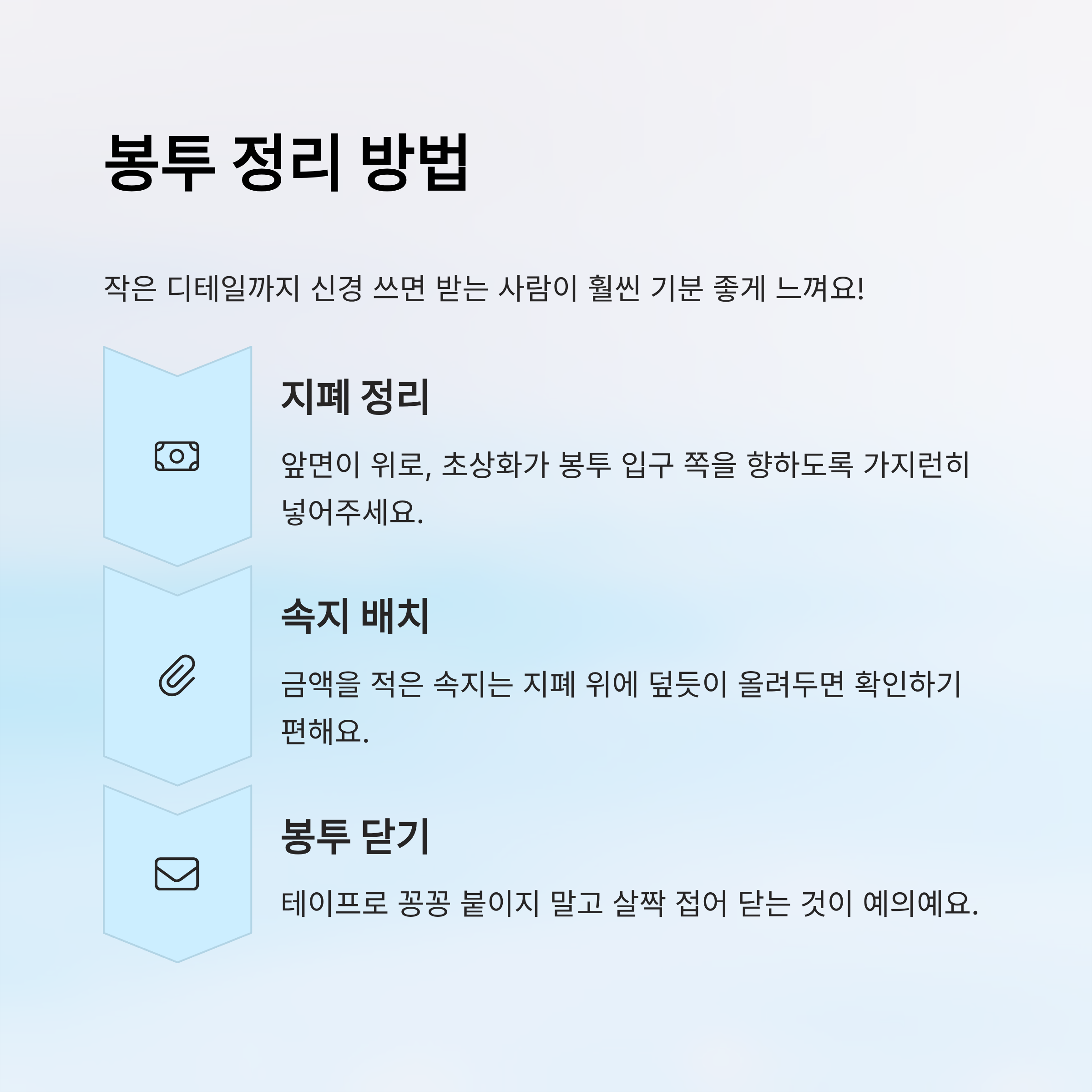 축의금 봉투를 쓸 때 이름과 금액만 신경 쓰고, 정작 봉투 속 지폐나 종이의 위치는 대충 넣는 경우가 많아요. 하지만 봉투 속 정리 방법까지 신경 쓰면 받는 사람 입장에서도 훨씬 기분이 좋아지고, 사회생활에서도 깔끔한 인상을 줄 수 있답니다. 작은 디테일이지만 효과는 크다는 사실! 🎀