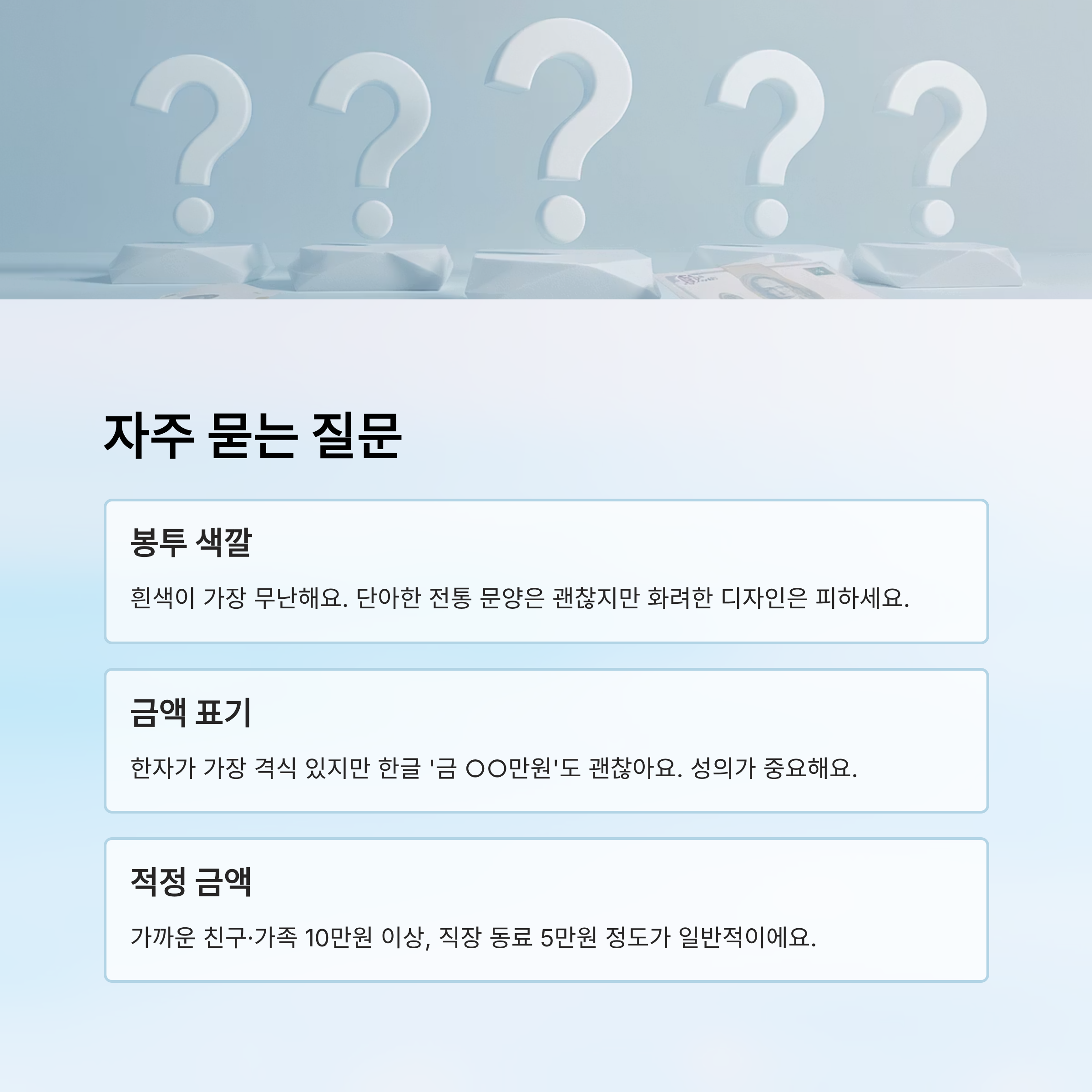 A1. 흰색이 가장 무난하고 전통적인 선택이에요. 하지만 단아한 전통 문양이나 깔끔한 디자인이 들어간 봉투도 괜찮아요. 다만 너무 화려하거나 캐릭터가 그려진 봉투는 피하는 게 좋아요.