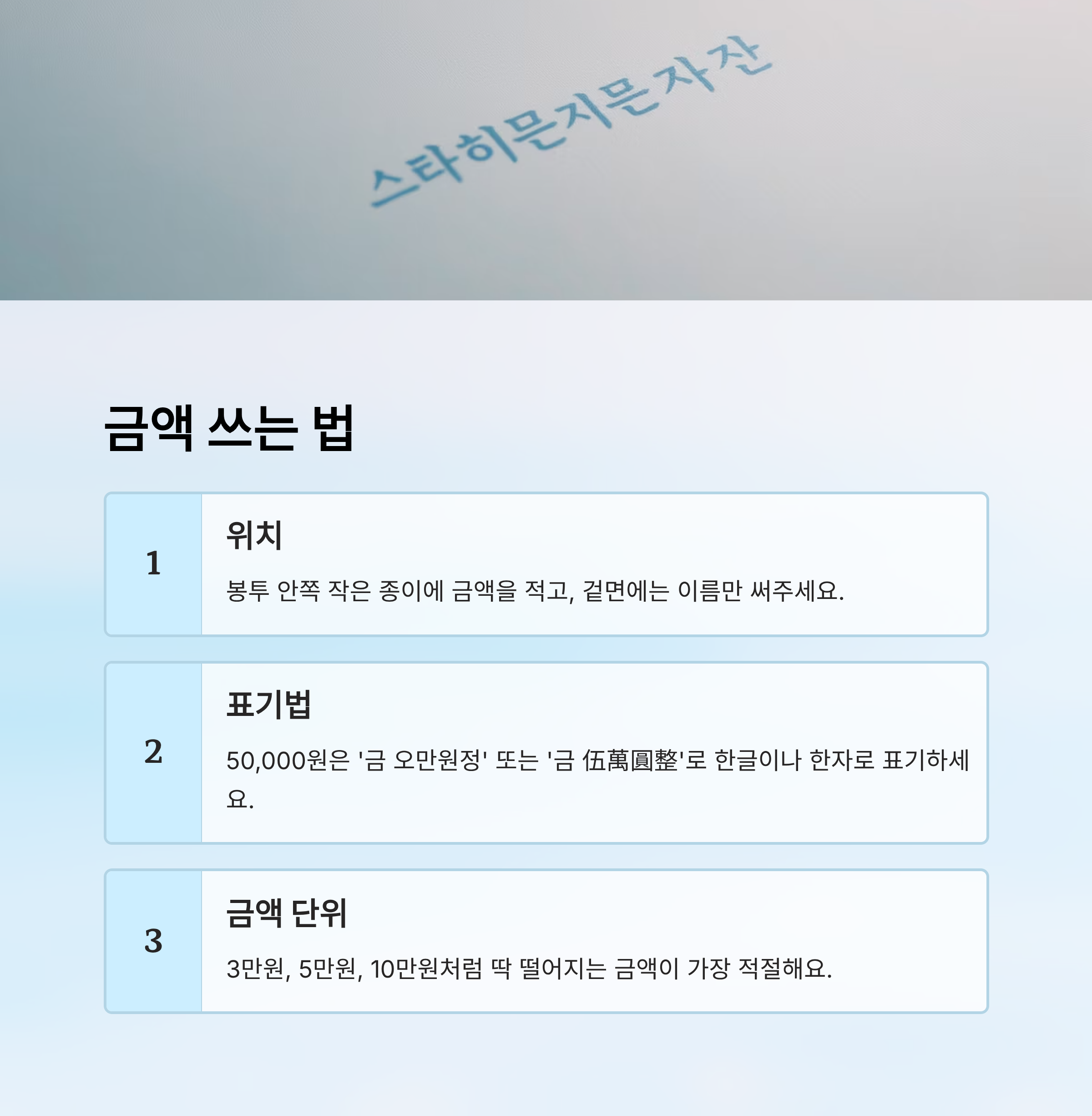 | 금액 표기 | 속지에 기재 후 덮기 | 봉투 겉면에 크게 표기 |