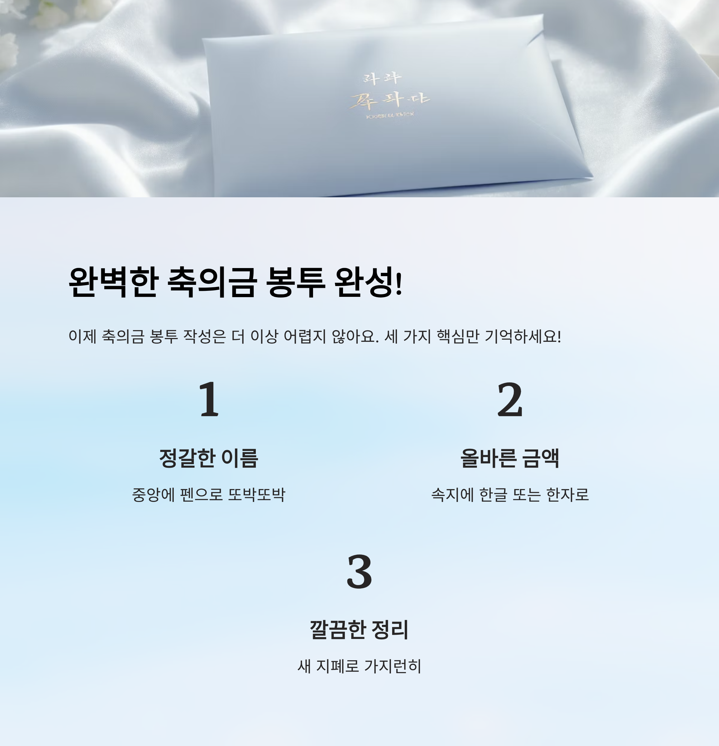 이렇게 나라별로 봉투 문화는 다르지만, 결국 ‘마음을 담아 전한다’는 점에서는 같아요. 그래서 우리도 봉투를 작성할 때 단순히 돈을 넣는 게 아니라, 받는 사람이 기분 좋게 느낄 수 있도록 준비하는 게 핵심이에요. ✨