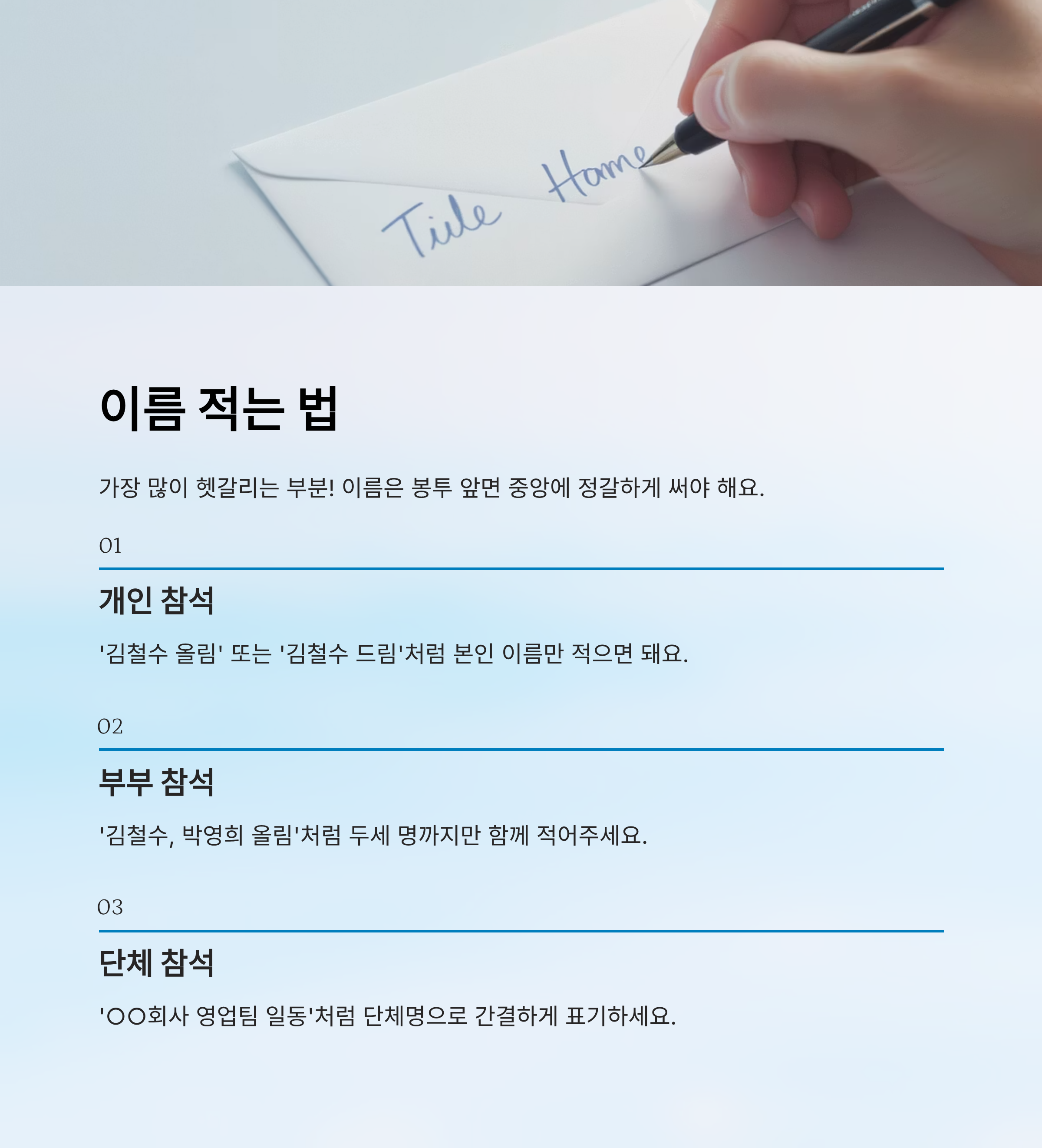 일반적으로 봉투 중앙에 ‘○○ 올림’ 또는 ‘○○ 드림’처럼 자신의 이름을 씁니다. 혼자 참석할 경우에는 본인 이름만 적으면 되고, 부부나 가족이 함께 참석한다면 ‘○○○, ○○○ 올림’처럼 두세 명을 함께 적어도 괜찮아요. 다만 너무 많은 이름을 나열하는 건 어색하니 보통은 대표자 이름만 쓰는 게 깔끔하답니다.