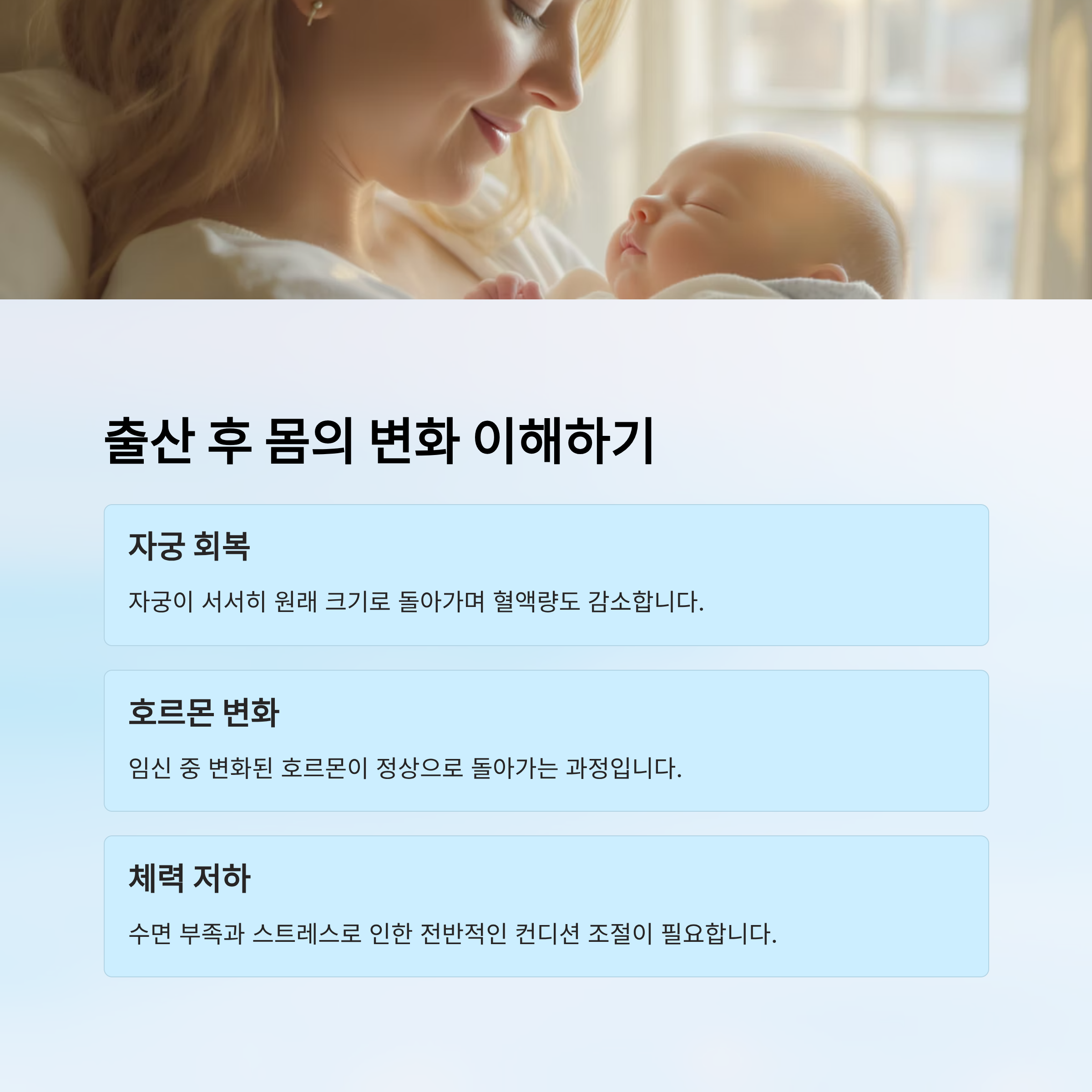 특히 출산 직후에는 몸이 임신 이전으로 돌아가기 위한 '회복기'를 거쳐야 해요. 자궁은 서서히 원래 크기로 돌아가고, 혈액량도 감소하면서 컨디션 조절이 필요하답니다.