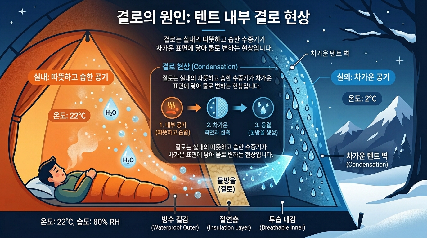 결로 현상은 과학적으로 보면 아주 단순합니다. 텐트 안팎의 온도 차이 때문이죠. 우리가 숨을 쉴 때 내뱉는 따뜻한 온기와 체온이 텐트 내부 공기를 데우는데, 외부의 차가운 공기와 맞닿은 텐트 원단 표면에서 수증기가 액체로 변하는 것입니다. 겨울철 집 안 창문에 이슬이 맺히는 것과 똑같은 원리에요.