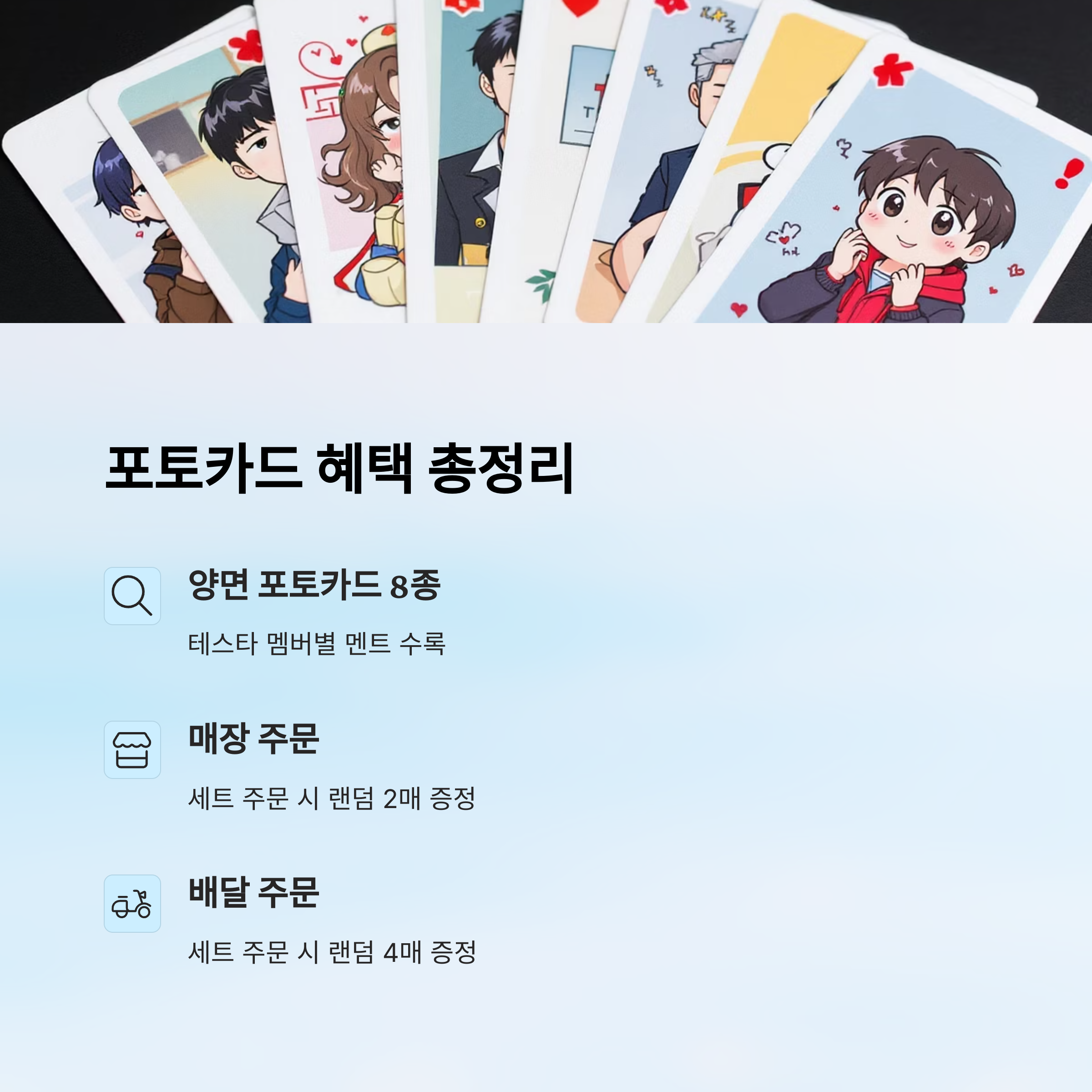 1. 매장에서 세트를 주문하면 포토카드 2매를 받을 수 있어요. 단, 매장에 따라 행사 참여 여부가 다르기 때문에 사전에 확인하는 게 좋아요. 미리 전화해보거나 공식 홈페이지 매장 안내를 보면 편리해요.