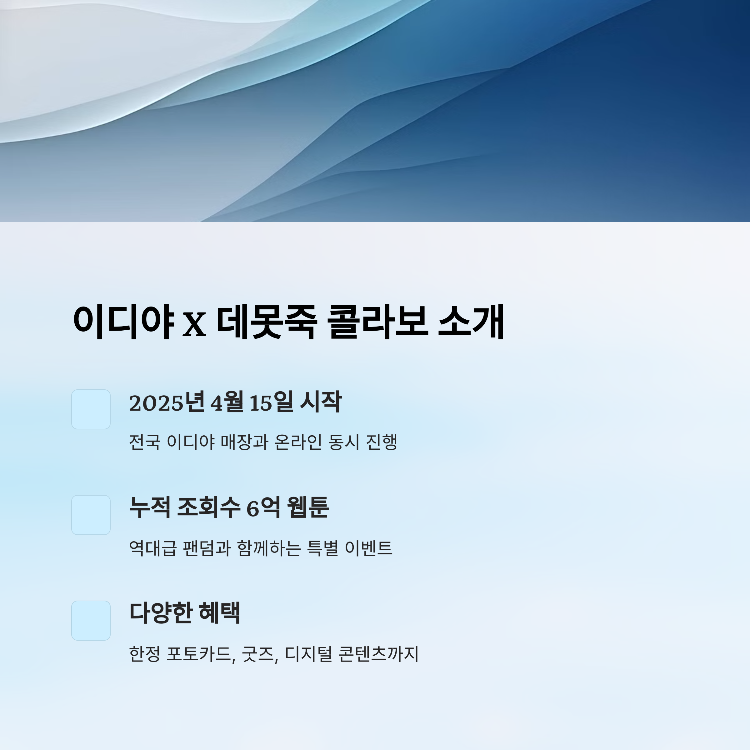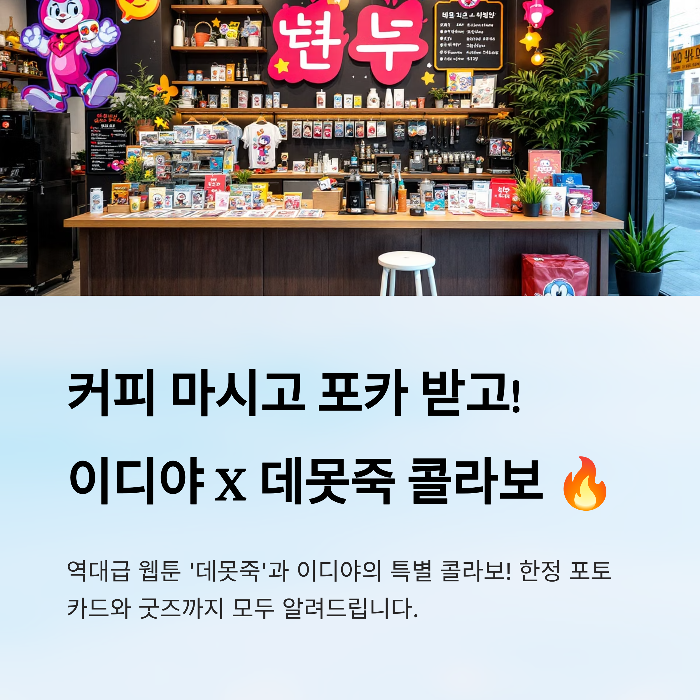 이 작품이 이번엔 이디야커피와 특별한 콜라보를 진행하며 다시 한 번 화제가 되었어요! 2025년 4월 15일부터 시작된 이 이벤트에서는 콜라보 세트 메뉴, 포토카드, 디지털 굿즈, 온라인 한정 굿즈까지 풍성한 혜택이 가득하답니다. ‘이디야커피 데못죽 세트’라는 말만 들어도 덕심이 솟구치는 분들 많죠? 😊