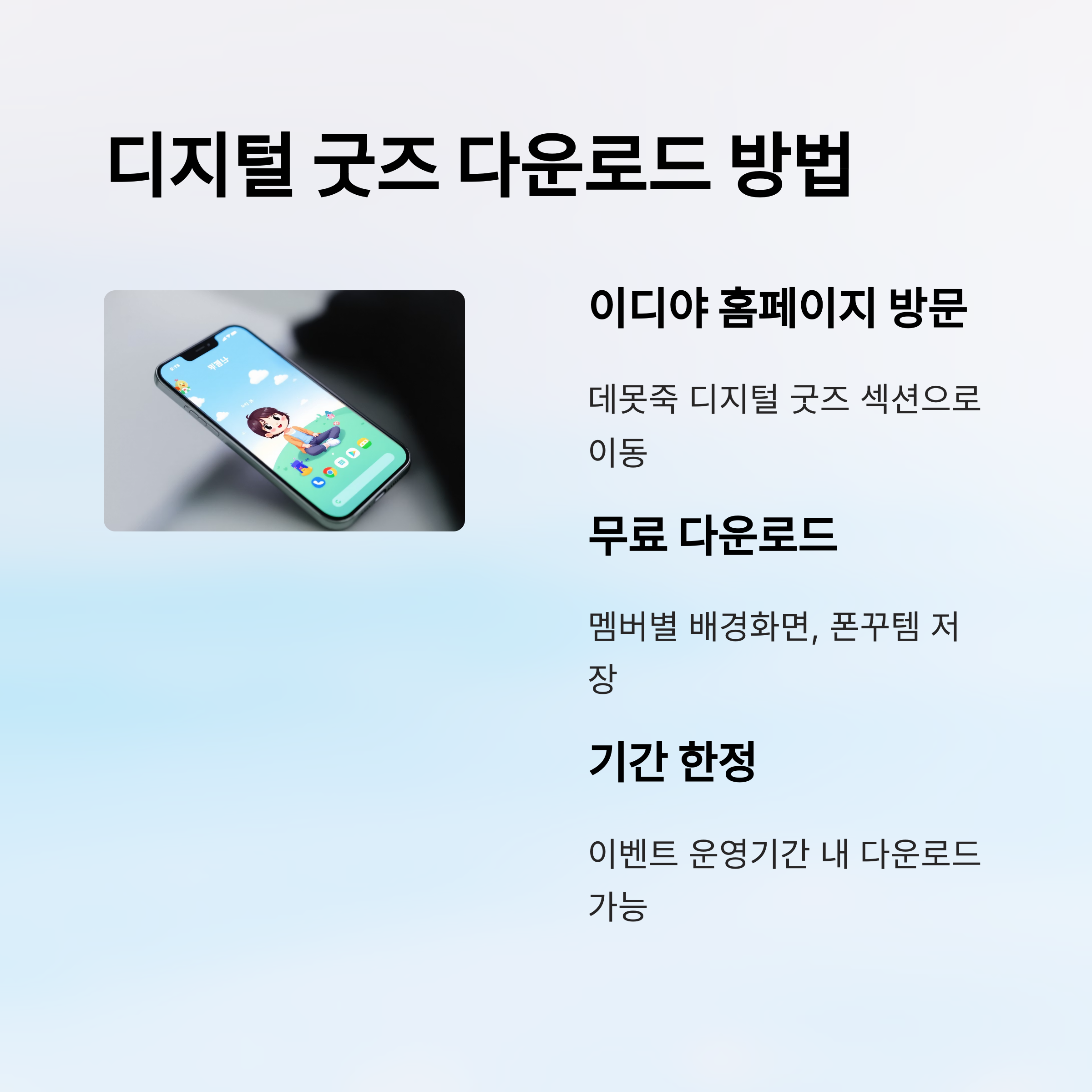 다운로드는 이디야커피 공식 홈페이지나 멤버스 앱, 공식 SNS 계정에서도 받을 수 있어요. 구글에 “이디야 데못죽 디지털 굿즈”만 검색해도 바로 연결돼요. 회원가입 없이 클릭만 하면 끝나는 초간단 과정이에요!