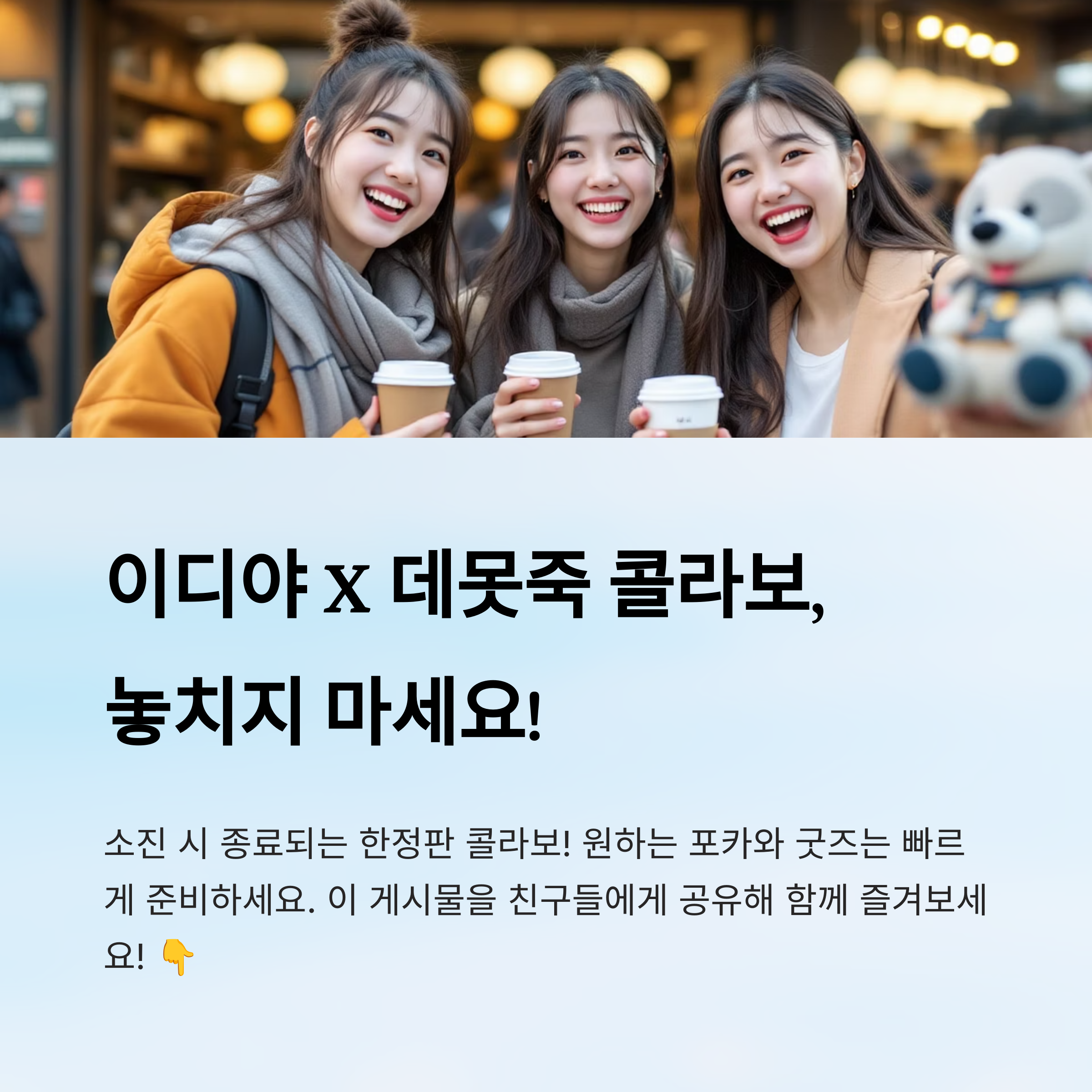매장별 행사 참여 여부는 다를 수 있기 때문에 사전 확인은 필수! 특히 세트 메뉴와 포토카드는 한정 수량이라 조기 품절될 수도 있어요. 저도 이거 보자마자 바로 달려갔는데… 인기 대폭발이더라고요. 제가 생각했을 때 이디야의 이번 콜라보는 진짜 역대급이에요. 🫶
