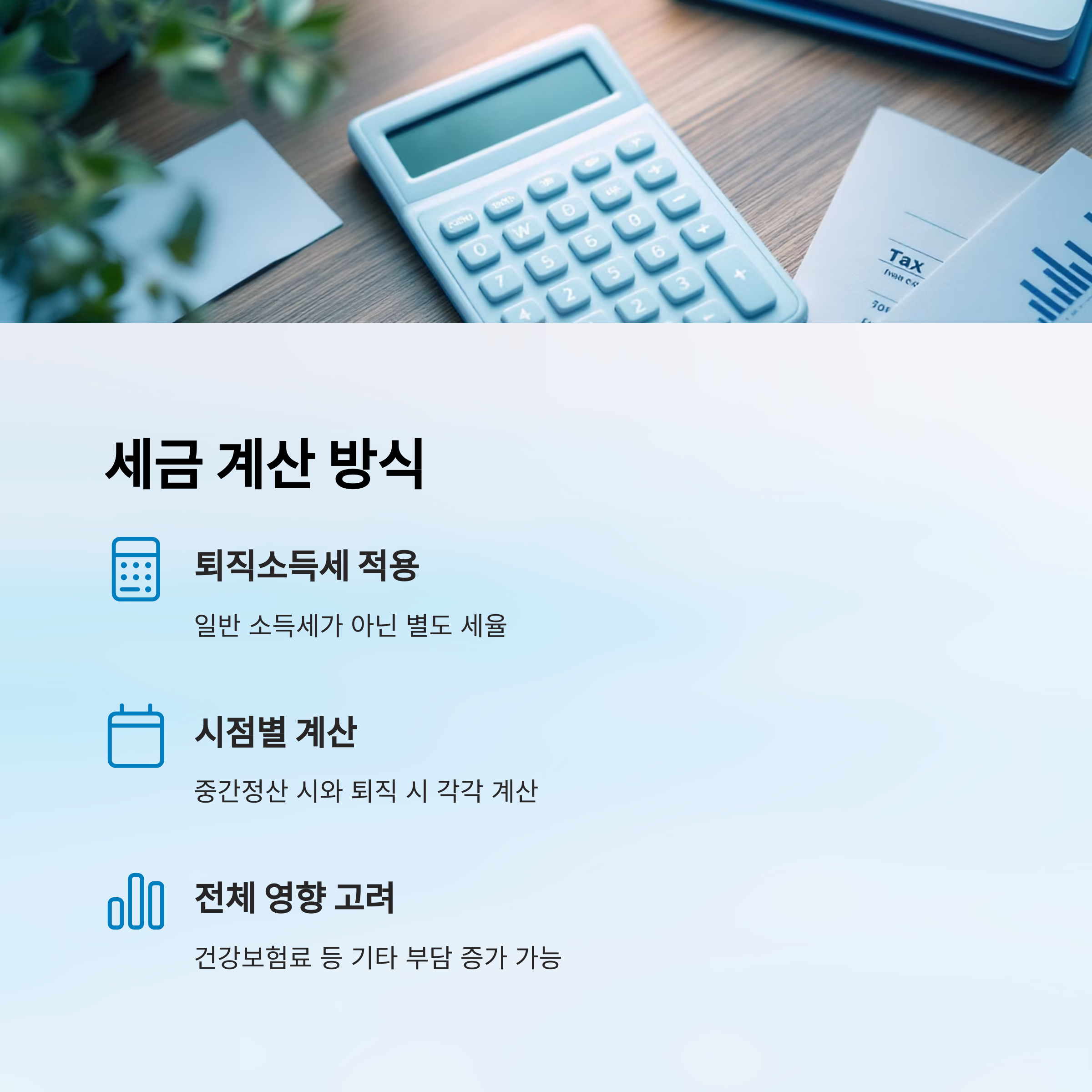 다만 주의할 점은 있어요. 퇴직 전 중간정산으로 일부를 받게 되면, 나중에 실제 퇴직할 때 지급받는 잔여 퇴직금에 대한 세금이 달라질 수 있다는 점이에요. 왜냐하면 퇴직소득세는 전체 근속기간, 퇴직금 총액을 기준으로 계산되는데, 중간정산 시점과 퇴직 시점이 다르면 계산이 복잡해지거든요.