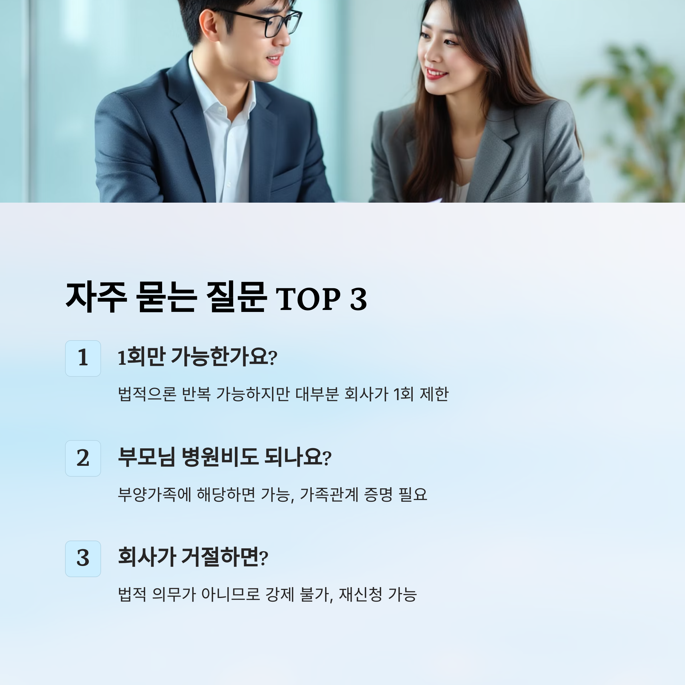 A1. 법적으로는 반복 신청이 가능하지만, 대부분의 회사는 1회로 제한하는 경우가 많아요. 회사 내규에 따라 다르니 사전에 확인이 필요해요.