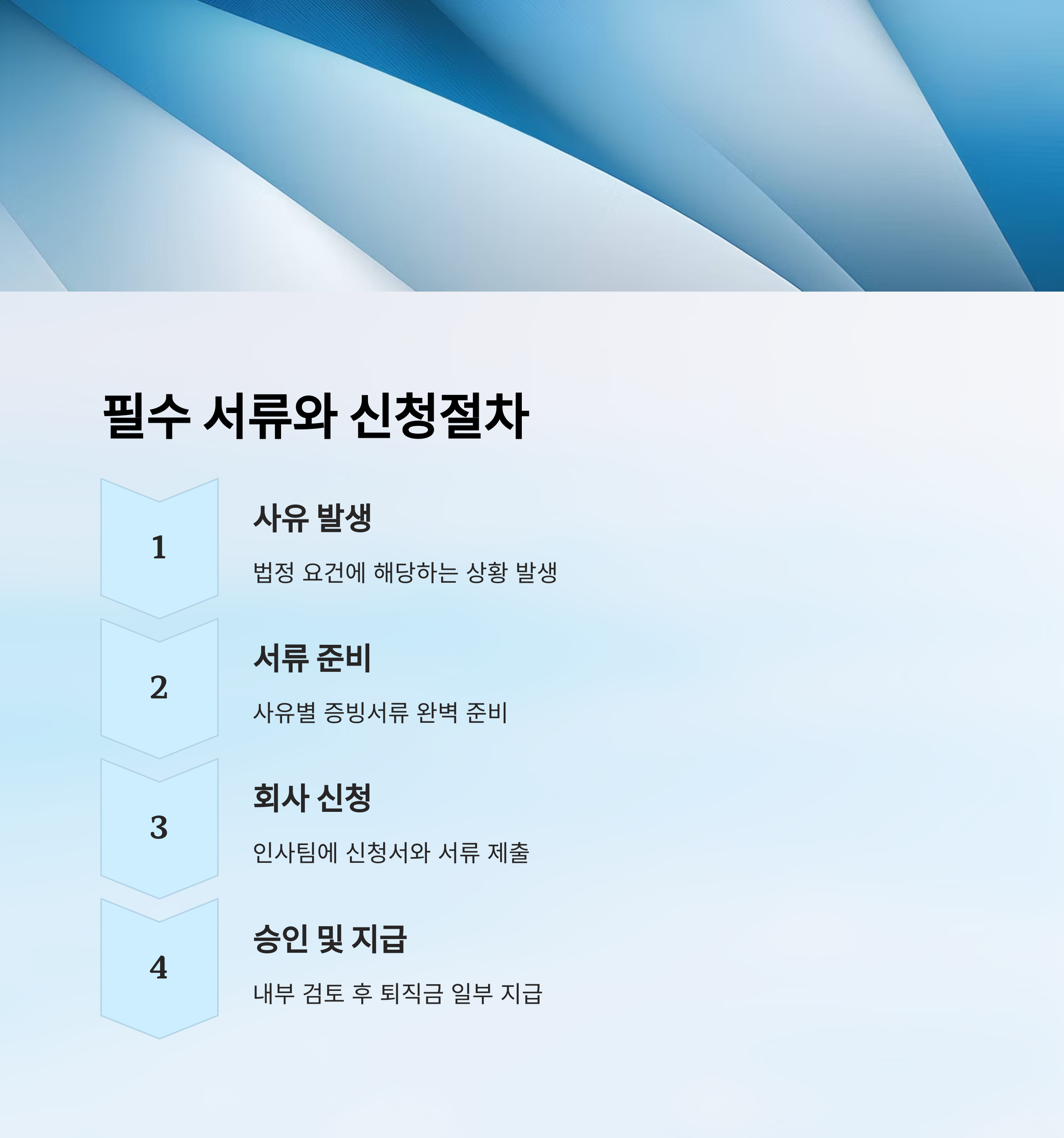 퇴직금 중간정산을 성공적으로 진행하기 위해선 무엇보다 '서류 준비'가 핵심이에요. 아무리 정당한 사유가 있다 하더라도, 증빙할 수 있는 서류가 부족하거나 요건에 맞지 않으면 거절될 수 있거든요. 지금부터는 사유별로 어떤 서류가 필요한지, 또 신청 절차는 어떻게 진행되는지를 알려드릴게요!