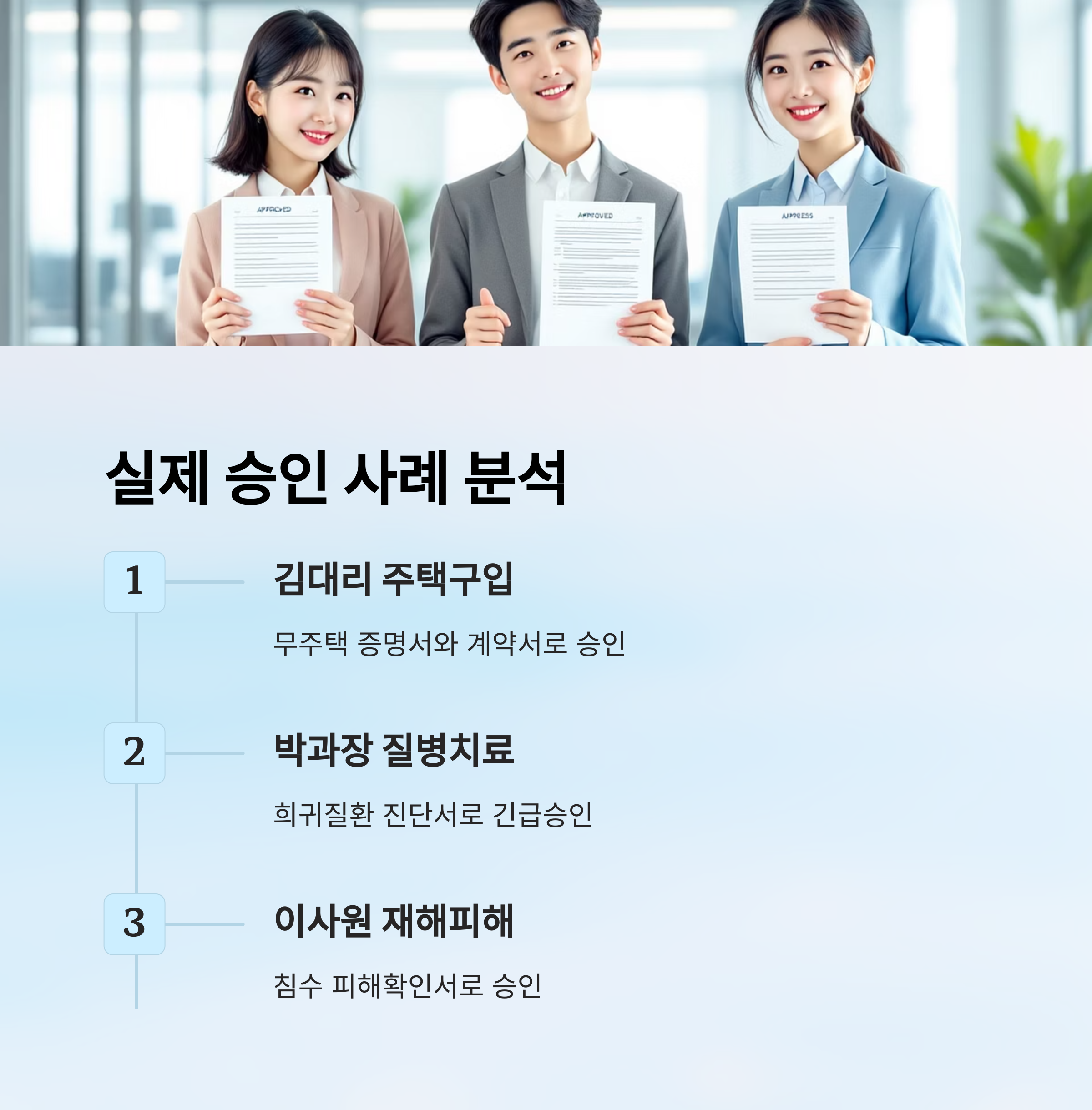 세 번째는 **자연재해로 피해를 본 사례**입니다. 대전에 사는 이사원은 집중호우로 인해 집이 침수돼 수리비용이 급히 필요했어요. 동사무소에서 발급받은 피해사실확인서와 주택 수리 견적서, 사진을 제출했어요. 회사에서는 재해 피해가 명확하다고 판단하고 정산을 승인했죠.