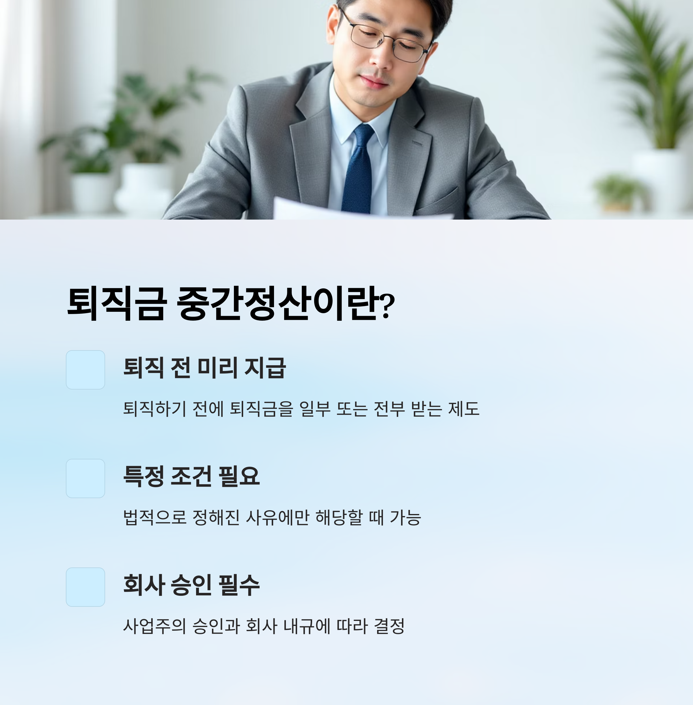 직장 생활 중 예상치 못한 자금 사정이 생기면 ‘퇴직금 중간정산’이라는 제도를 한 번쯤 떠올리게 돼요. 원래는 퇴직 후 일시금으로 받는 퇴직금을, 정해진 요건에 맞는다면 퇴직 전에 일부 받을 수 있는 제도가 바로 중간정산이에요.