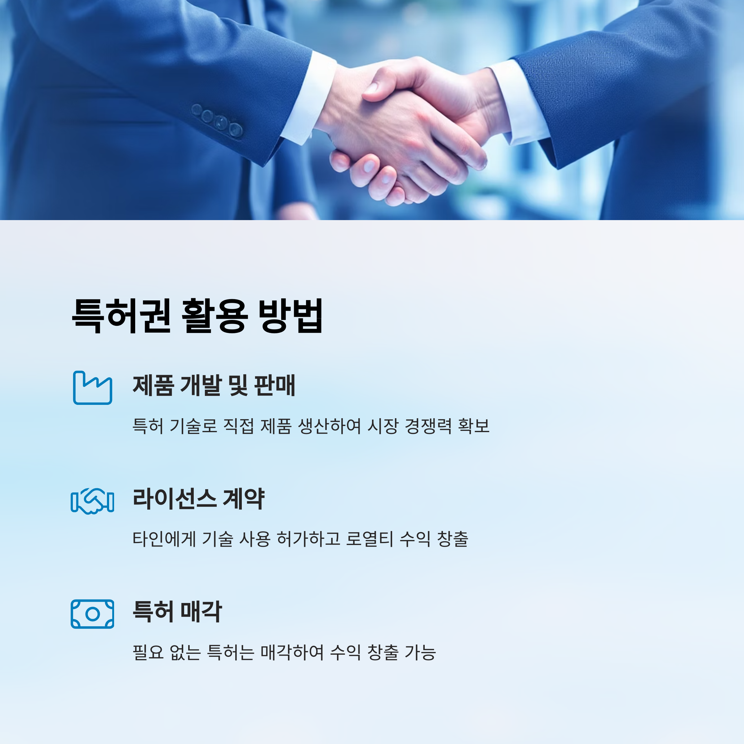 2️⃣ **라이선스(기술 이전) 계약** – 기업이나 개인에게 특허 기술을 사용하도록 허가하고 사용료(로열티)를 받을 수 있어요. 이는
