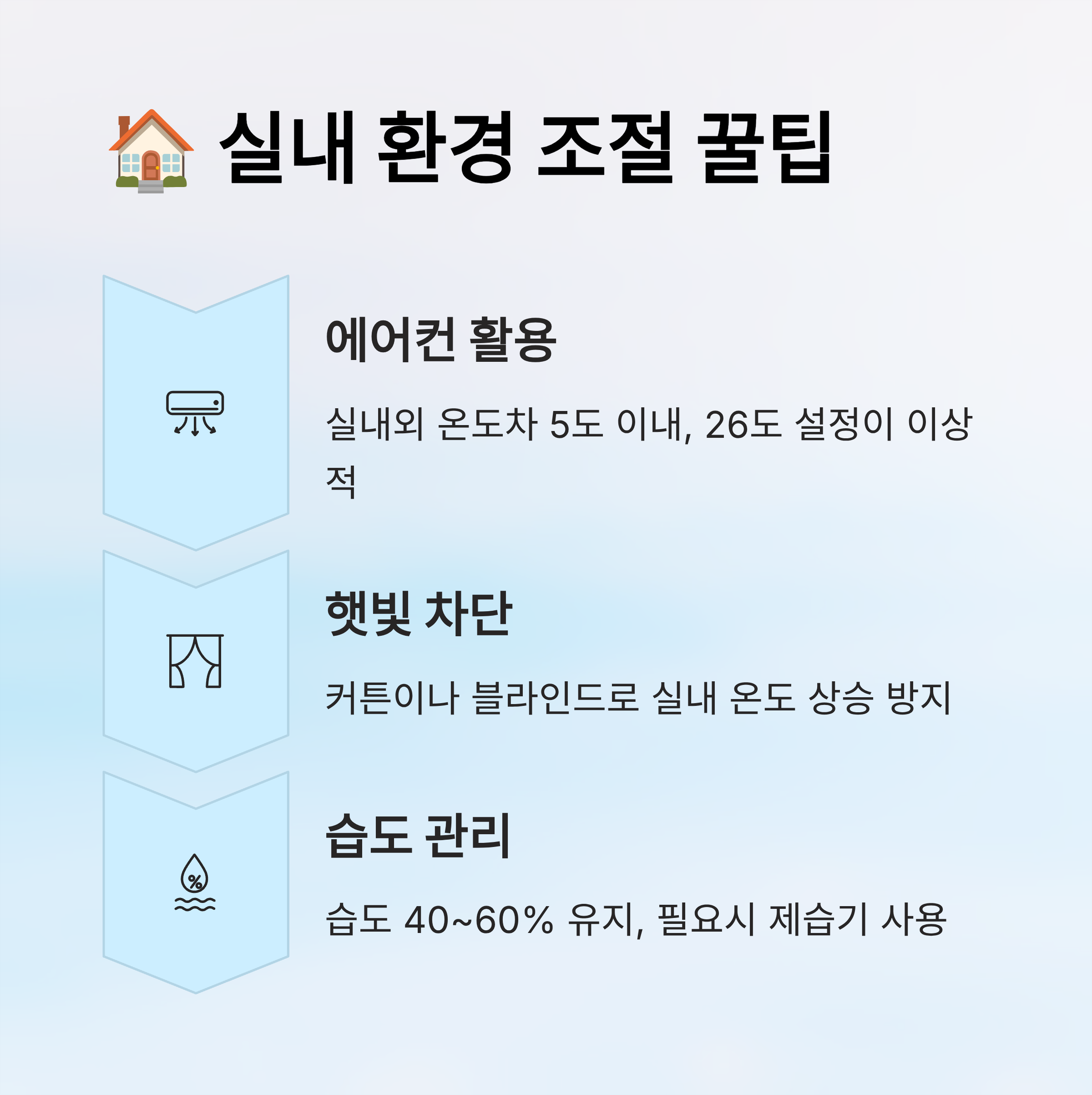습도도 중요한데, 너무 건조하거나 너무 습하면 호흡기에도 영향을 줄 수 있어요. 습도는 40~60% 수준으로 유지하는 게 좋고, 필요할 경우 제습기나 선풍기 병행 사용도 추천해요.