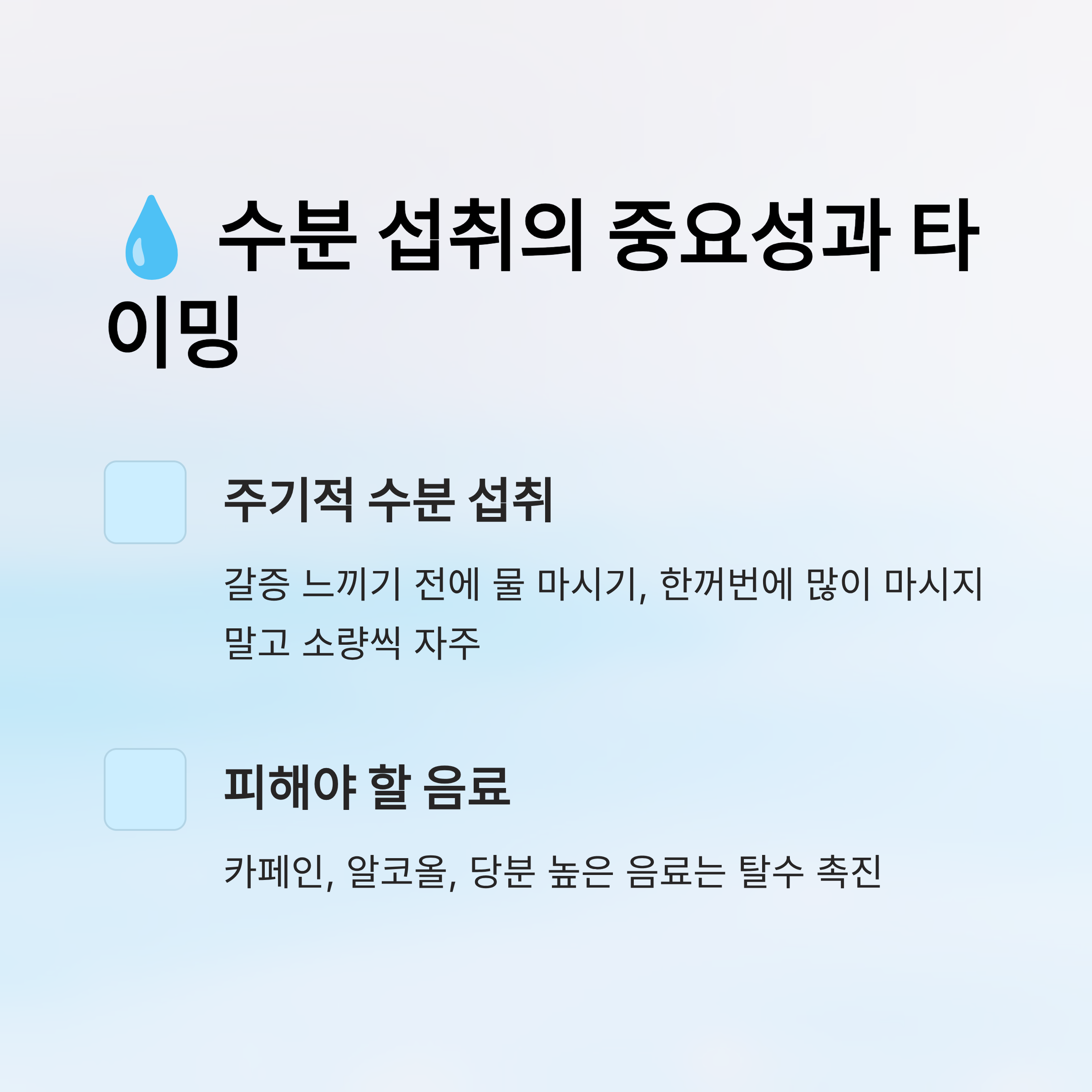 | 노인 | 갈증 인지 저하, 더위에 둔감 | 수시로 수분 보충, 실내 온도 체크 |