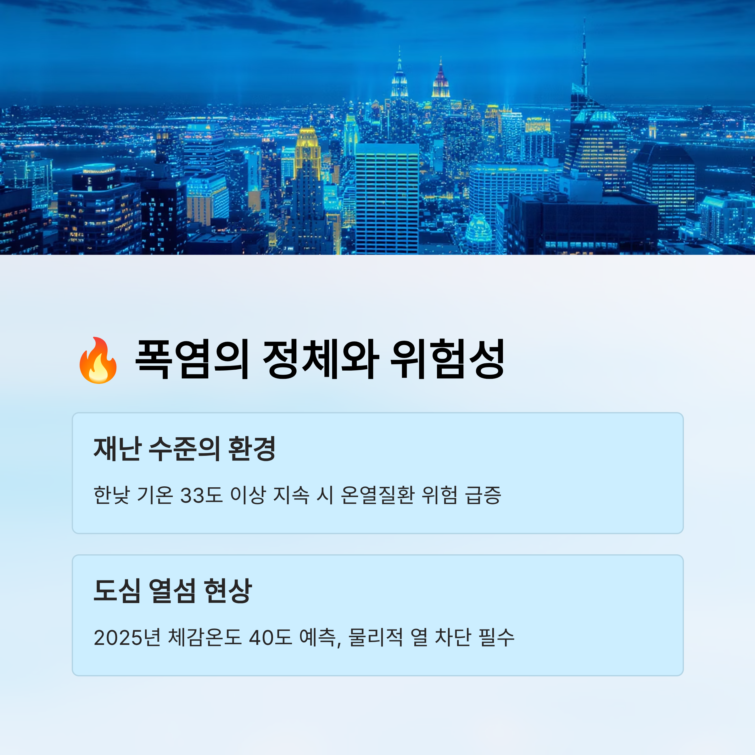 2025년의 폭염은 ‘도심 열섬 현상’이 더해져 아파트 단지나 도시 중심지에서 체감온도가 40도 가까이 올라갈 수 있다는 예측도 있어요. 이럴 때는 물리적인 열 차단과 체온 관리가 필수랍니다. 가볍게 넘길 수 없는 수준이죠.