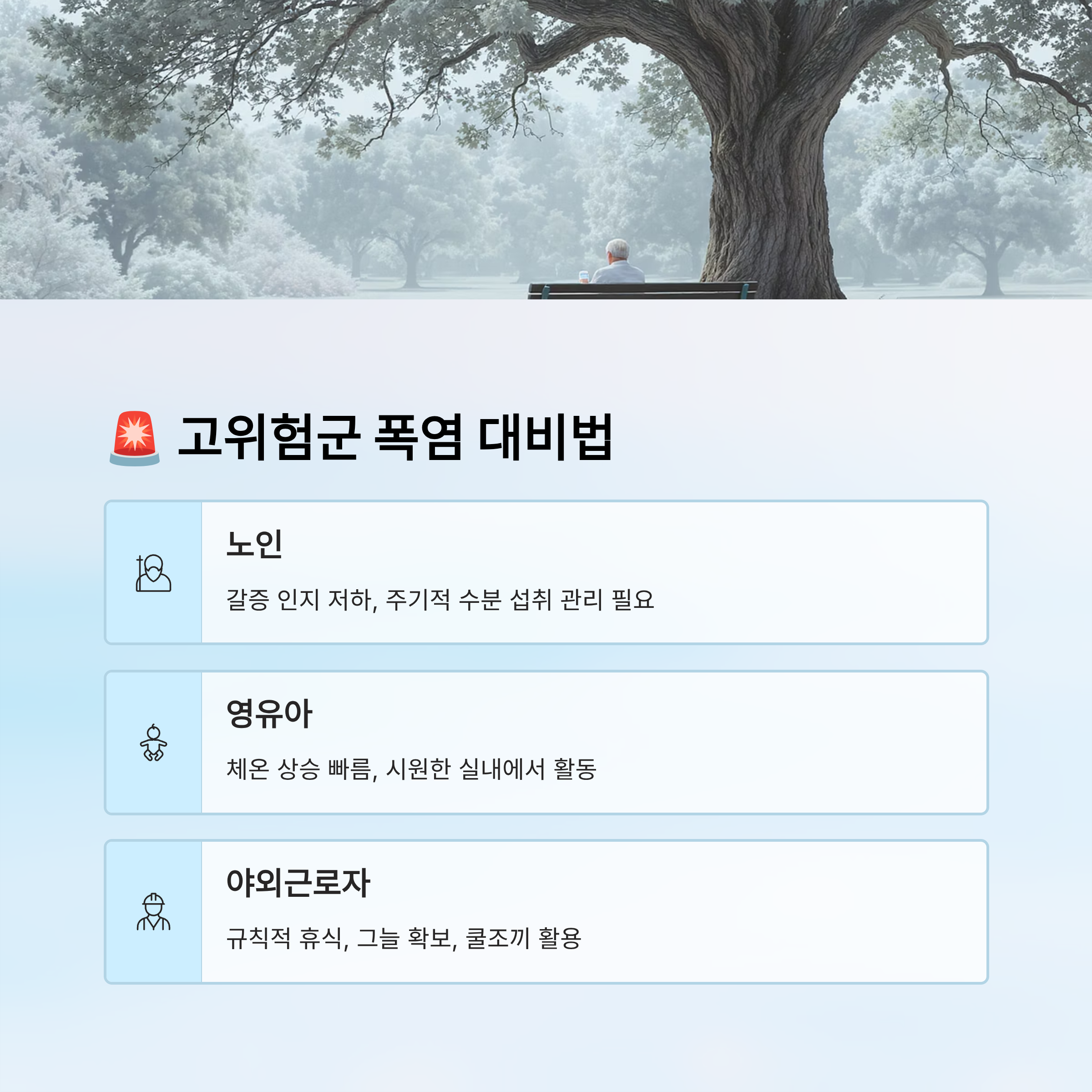 고위험군은 스스로 감지하지 못하는 경우가 많아서 주변 가족이나 동료의 관심이 정말 중요해요. 더위에 노출되었을 땐 즉시 시원한 곳으로 이동하고, 수분을 조금씩 나눠 마시는 게 가장 먼저 할 일이에요. 🌞