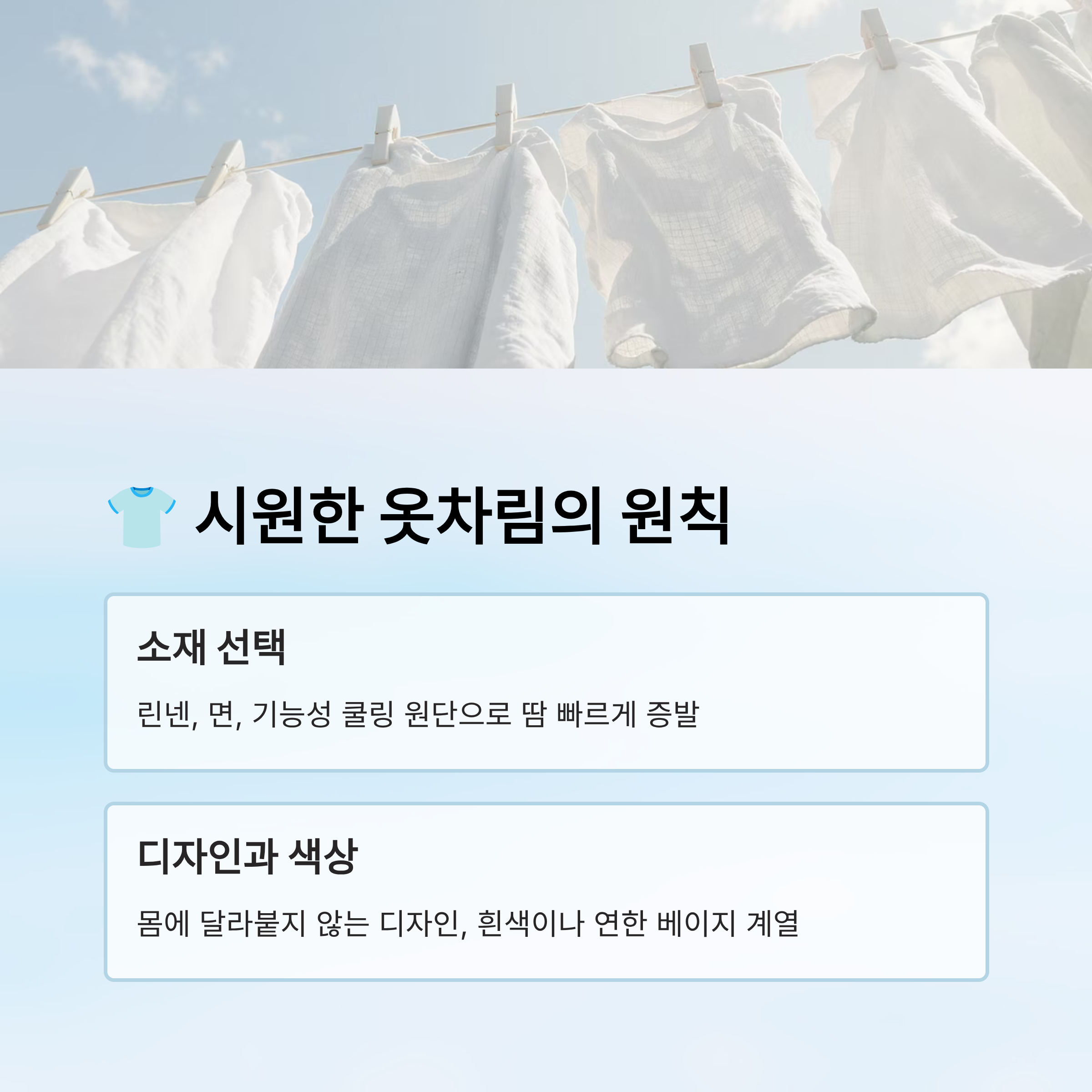 린넨, 면, 기능성 쿨링 원단으로 만든 옷이 좋고, 몸에 너무 달라붙지 않으면서 바람이 잘 통하는 디자인이면 더 좋아요. 색상은 흰색이나 연한 베이지처럼 열을 반사하는 계열이 더 효과적이에요.