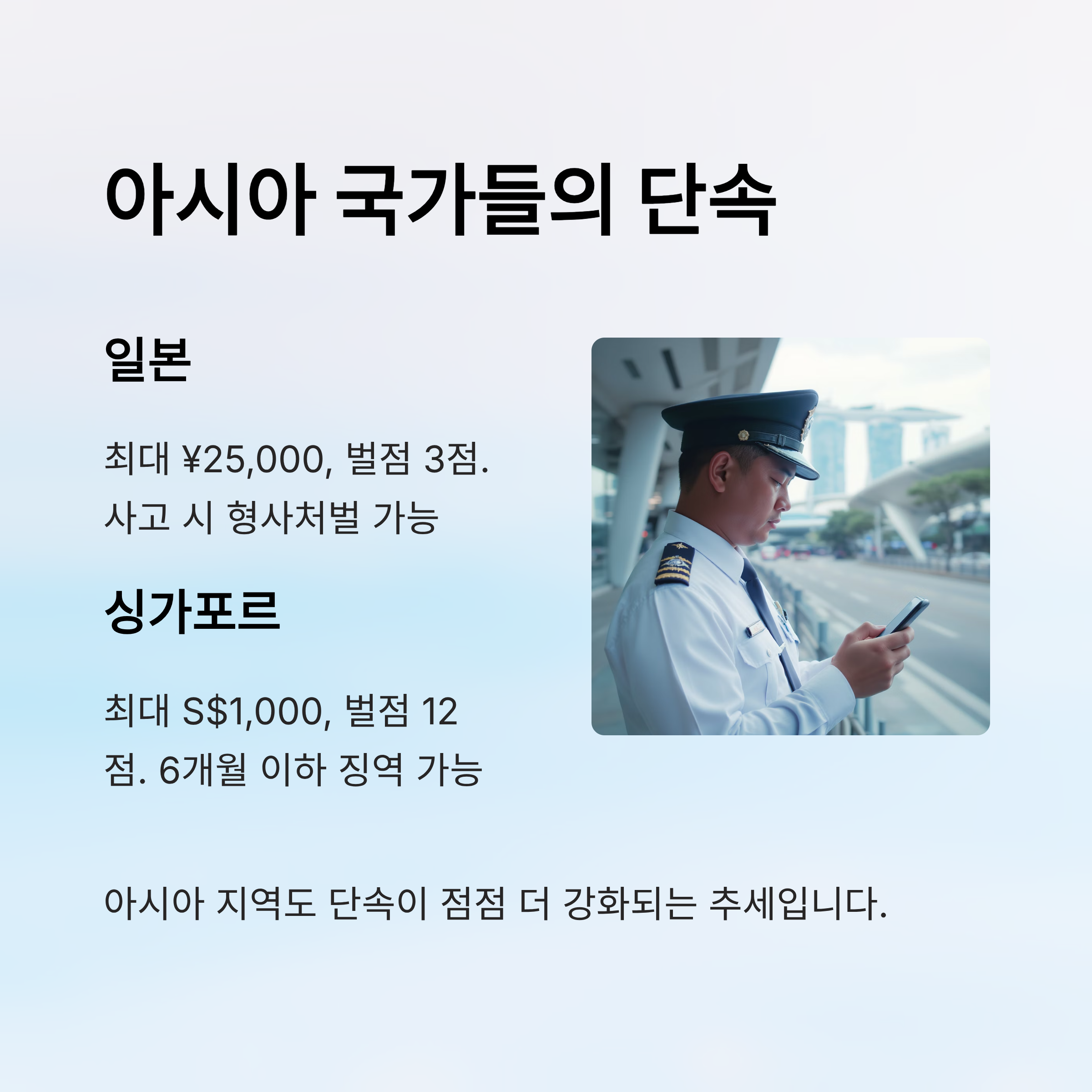 이처럼 아시아 지역도 단속이 점점 더 강화되는 추세예요. 특히 싱가포르나 일본처럼 형사처벌까지 가능한 국가도 있으니, 해당 국가에서 운전할 계획이 있다면 반드시 법규를 확인해야 해요. 벌점이나 벌금 이전에, 안전을 위해 기본적으로 휴대전화는 손에서 놓는 게 좋아요!