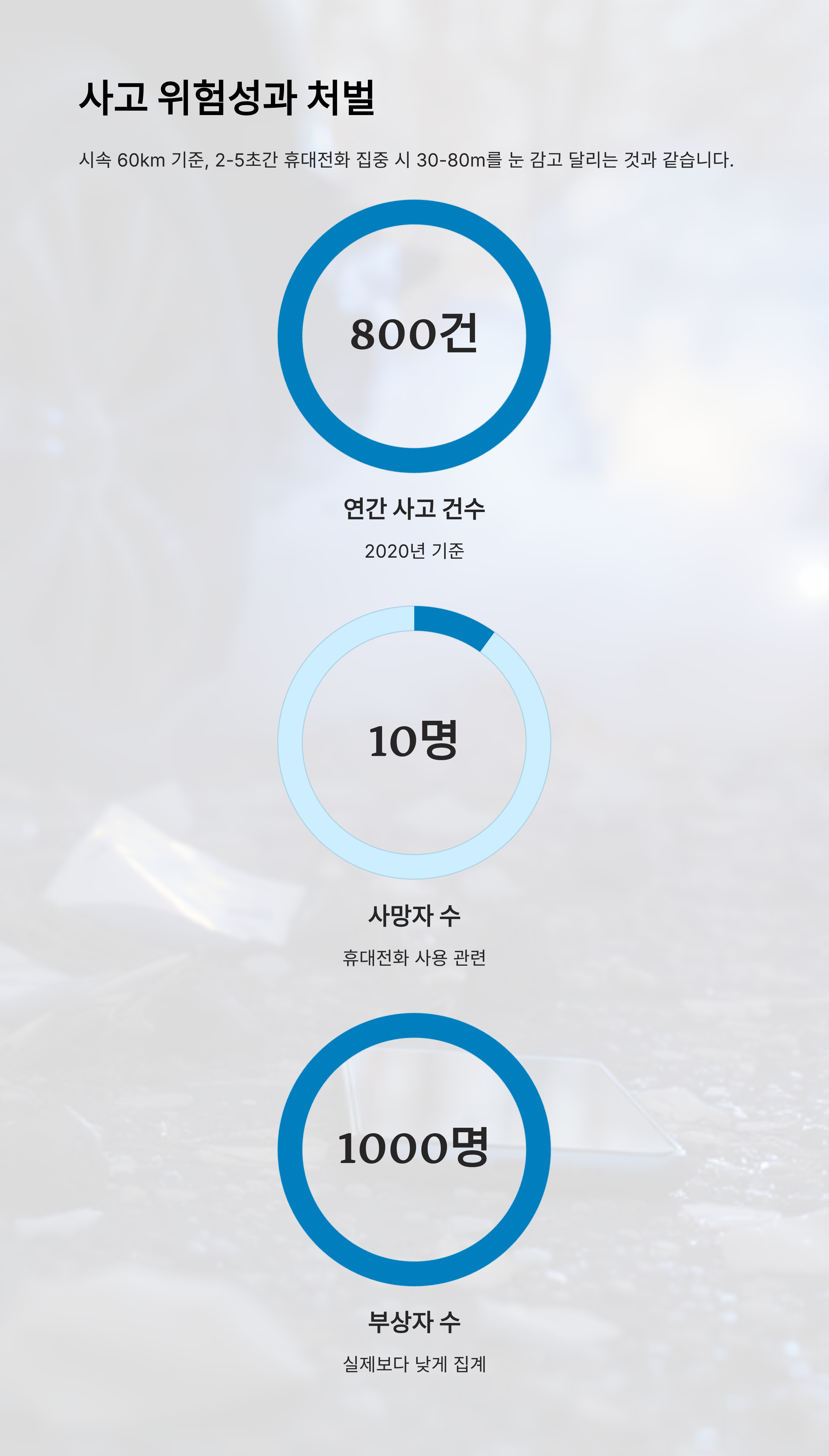운전 중 휴대전화 사용은 단순한 교통법규 위반을 넘어, 치명적인 사고로 직결될 수 있어요. 전문가들은 짧게는 2초, 길게는 5초 정도 운전자가 휴대전화에 집중하면, 시속 60km 기준 약 30~80m를 눈 감은 채 달리는 것과 같다고 표현해요. 실제로 많은 사고가 이처럼 ‘단 몇 초’의 부주의로 발생하죠.