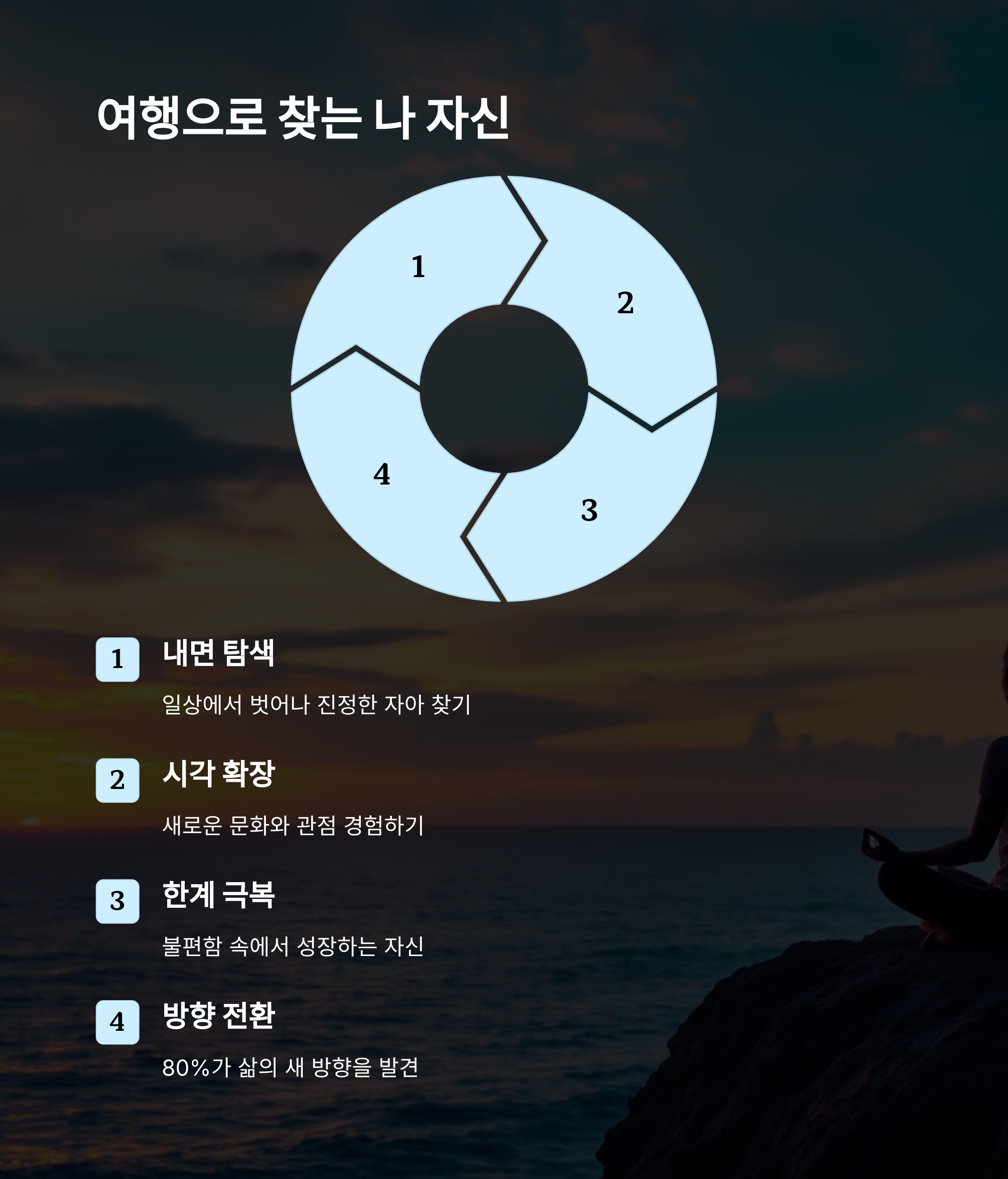 여행을 통한 성장은 물리적인 거리의 이동을 넘어 정신적인 확장을 의미해요. 타지에서 보내는 한 달은 결국 새로운 ‘나’를 만드는 시간이에요. 삶의 속도를 잠시 늦추고, 그 틈에서 진짜 내 마음을 만날 수 있는 거죠.