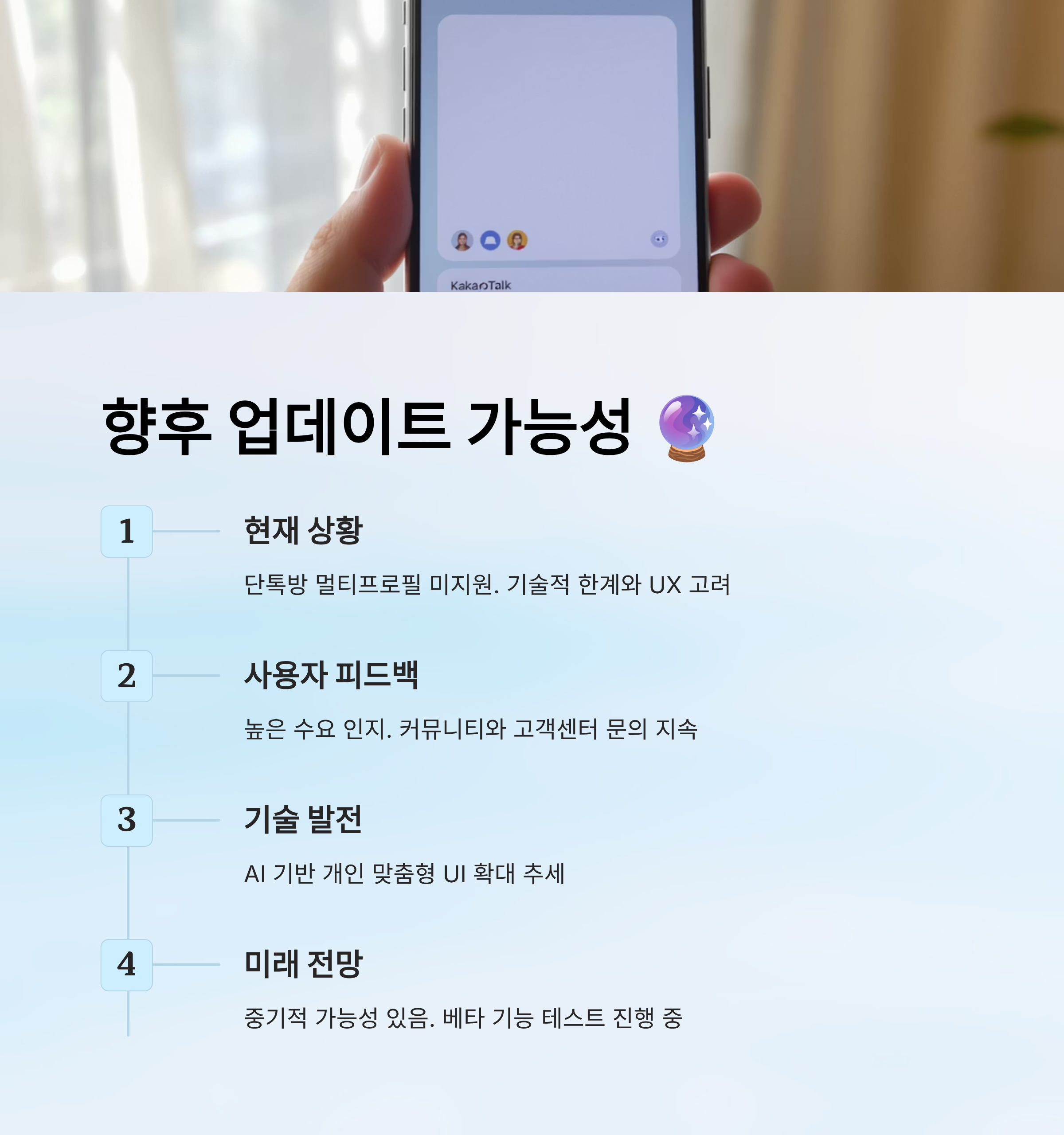 카카오 측에서도 이 기능에 대한 수요를 인지하고 있지만, 아직 공식적으로 “단체톡방 멀티프로필 적용 계획”은 발표되지 않았어요. 이유는 앞서 설명했던 기술적 구조, 동기화 문제, UX 혼란 등이 해결되지 않았기 때문이에요. 현재는 일관성과 시스템 안정성이 더 중요하게 고려되고 있는 상태예요.
