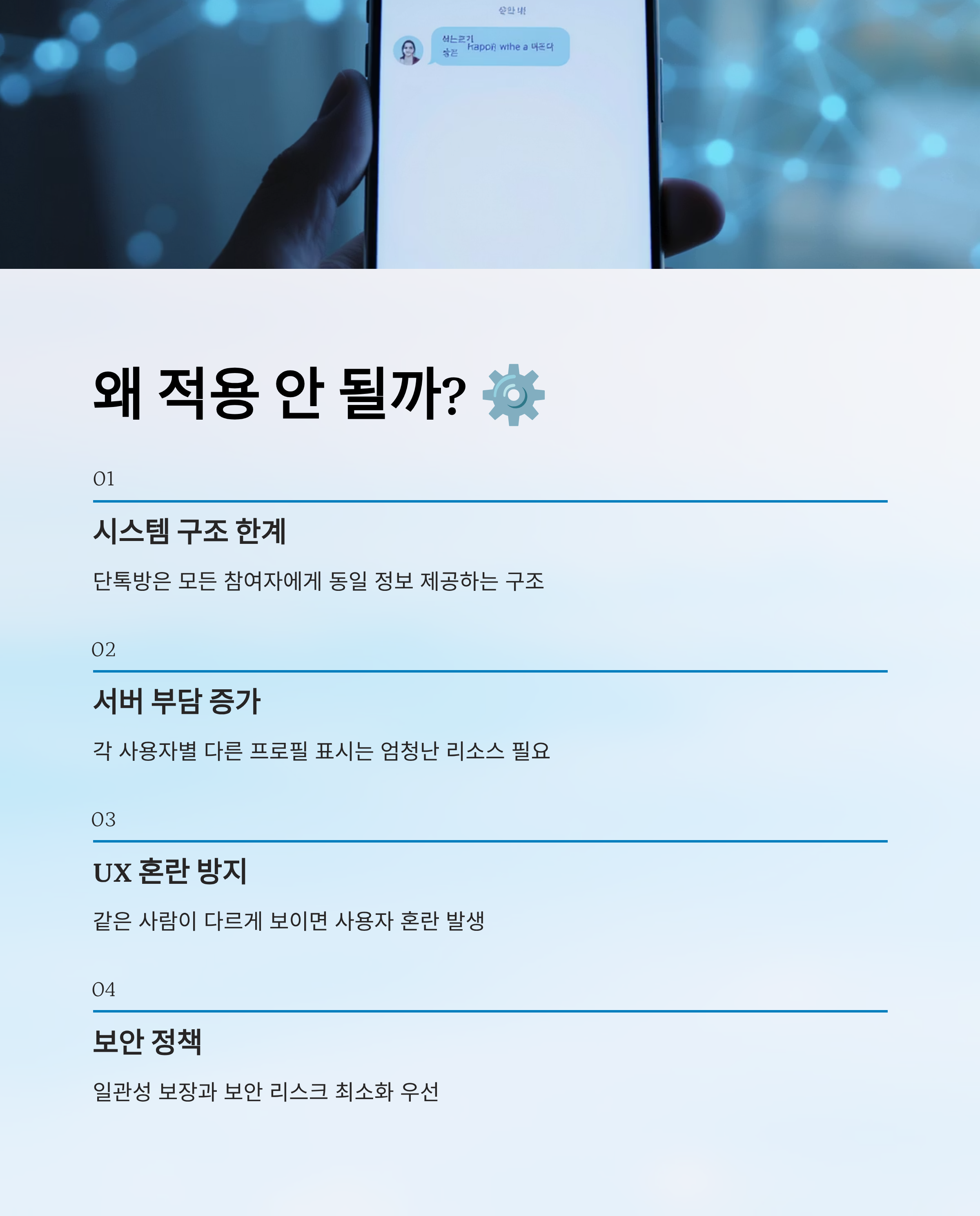 기술적으로 단체방에 참여한 모든 사람에게 각기 다른 프로필을 보여주려면, 같은 화면에서도 사용자마다 다른 프로필 데이터를 실시간 반영해야 해요. 이건 엄청난 서버 리소스를 요구하고, 대화 흐름에 혼란을 줄 수 있어요. 그래서 현재 카카오 시스템은 단체톡방에서 "기본 프로필 고정 표시"를 채택하고 있어요.