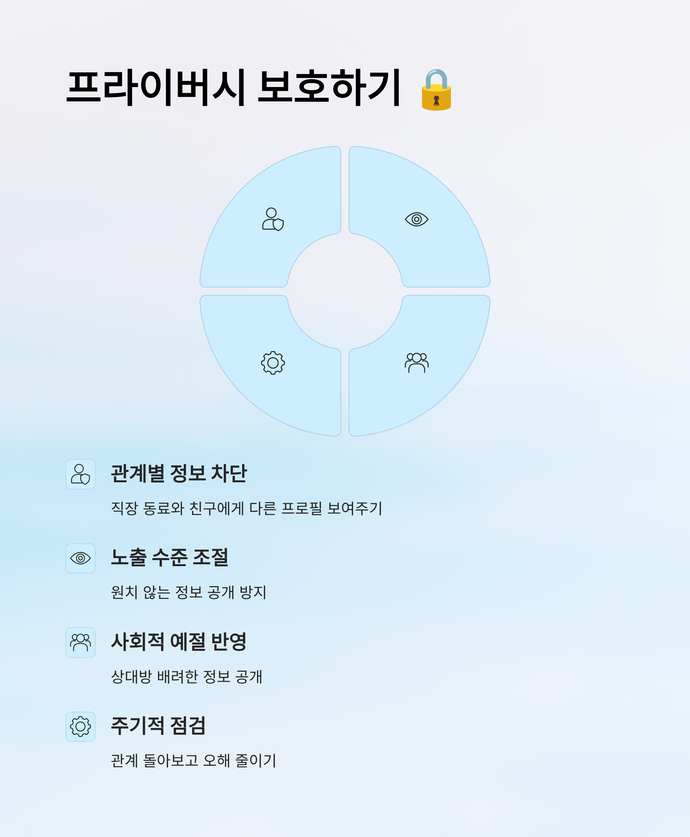 이런 기능들을 적절히 조합하면, 나만의 ‘프라이버시 방어선’을 만들 수 있어요. 단지 정보를 숨긴다는 개념이 아니라, 관계별로 정보 공개 수준을 조절하는 지혜라고 생각하면 돼요. 프라이버시도 관리의 시대니까요! 😌
