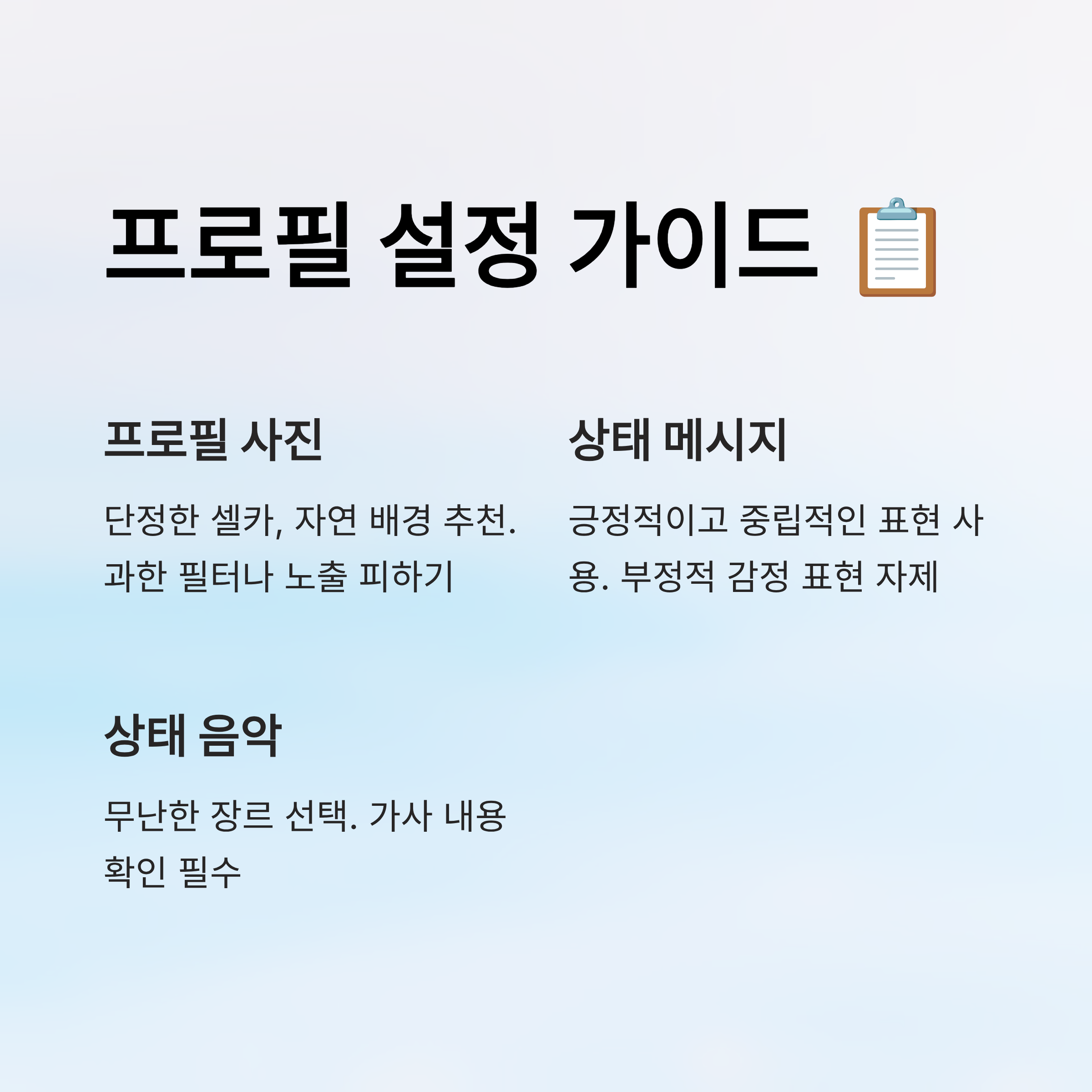 | 상태 메시지 | 긍정적 문구, 중립적 표현 | 부정적 감정, 사적인 내용 |
