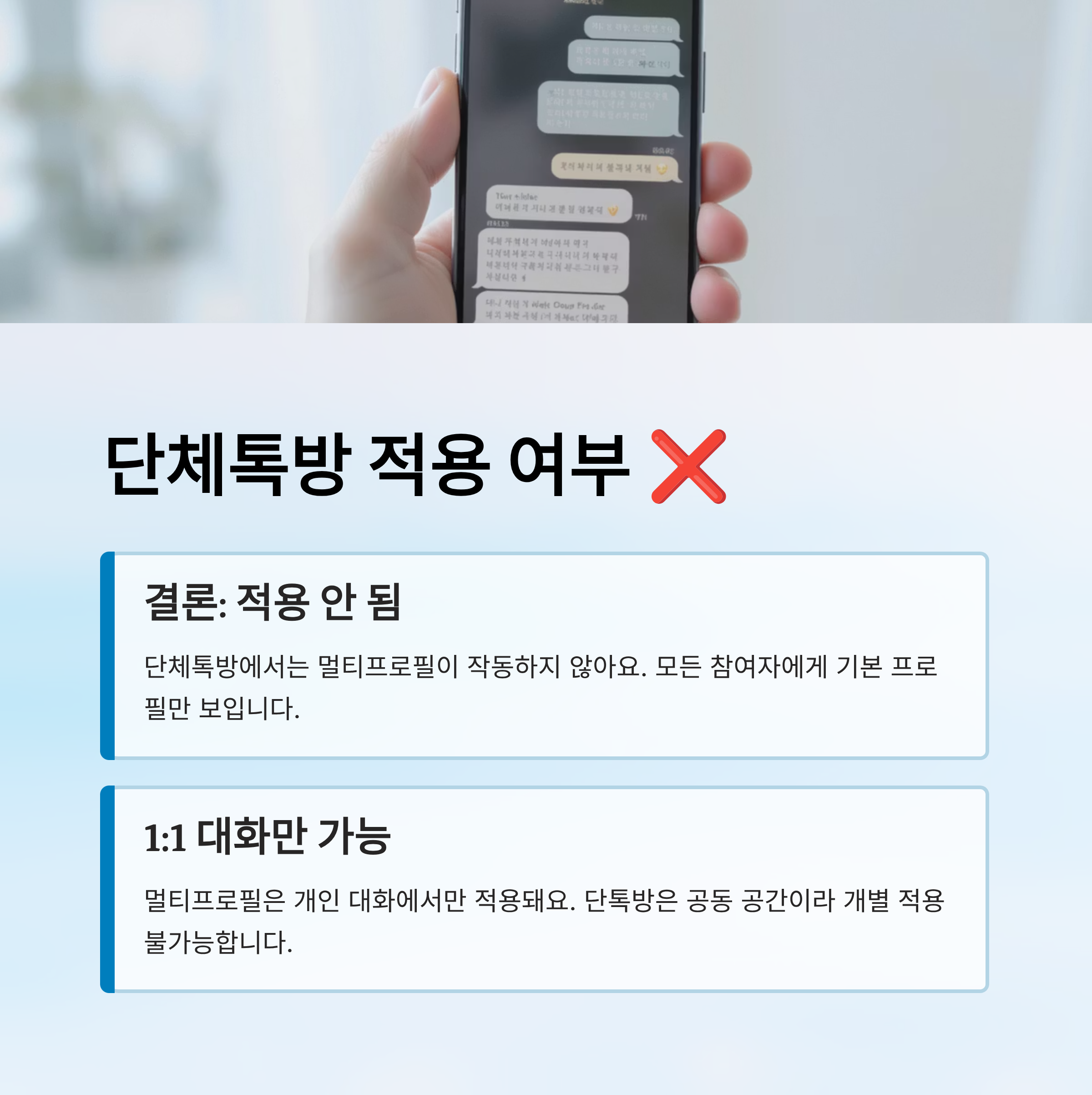 단체 대화방은 하나의 공동 공간으로서, 시스템이 모든 참여자에게 일괄적으로 동일한 프로필 정보를 보여주는 구조예요. 개별 적용이 안 되는 이유는 바로 이런 ‘동시성’과 ‘공통 정보 표시’ 때문이에요. 다르게 말하면, 멀티프로필은 단톡방이라는 다인 채널에서는 작동하지 않도록 설계된 거죠.