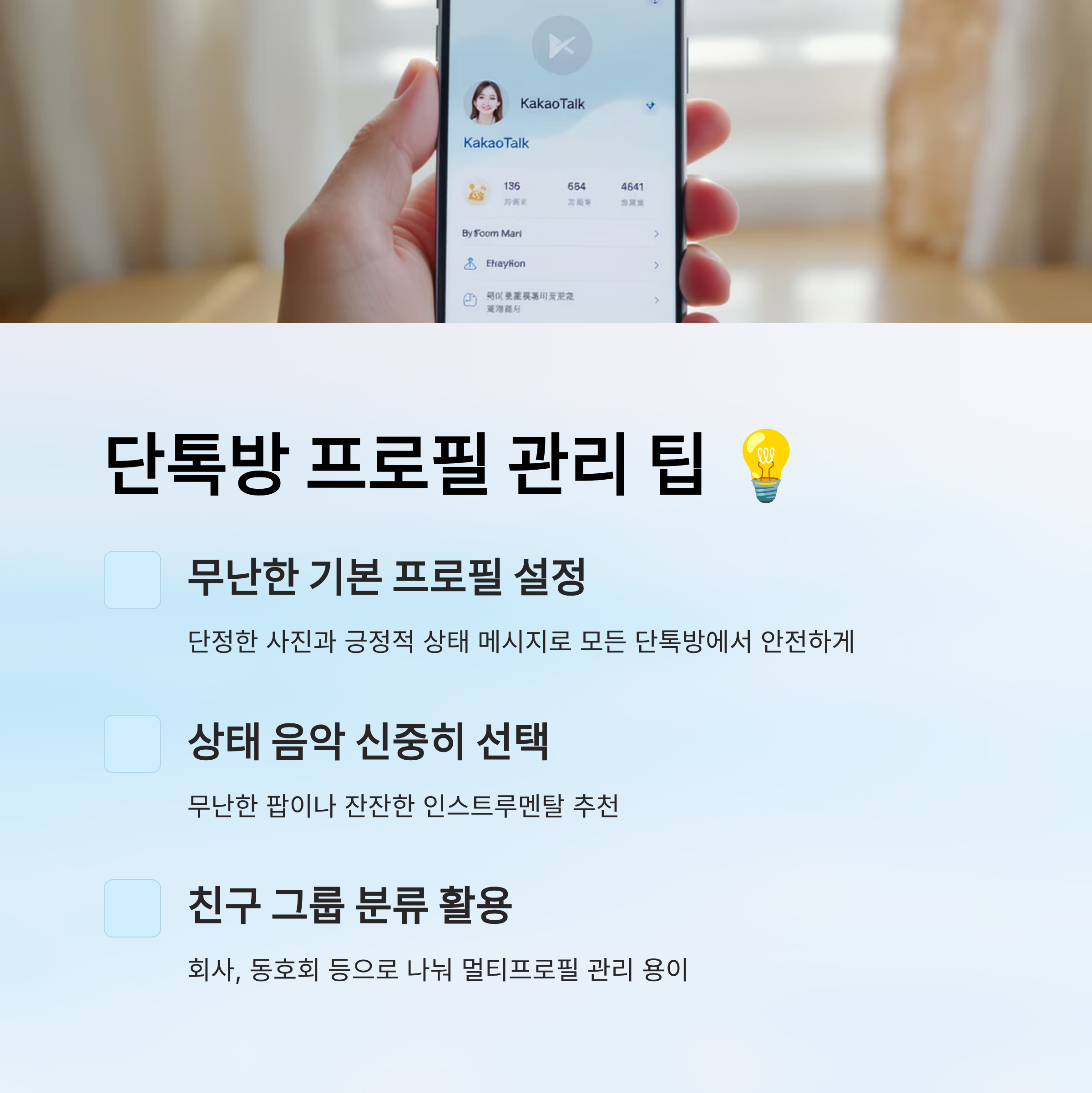 | 상태 메시지 | 긍정적 문구, 중립적 표현 | 부정적 감정, 사적인 내용 |