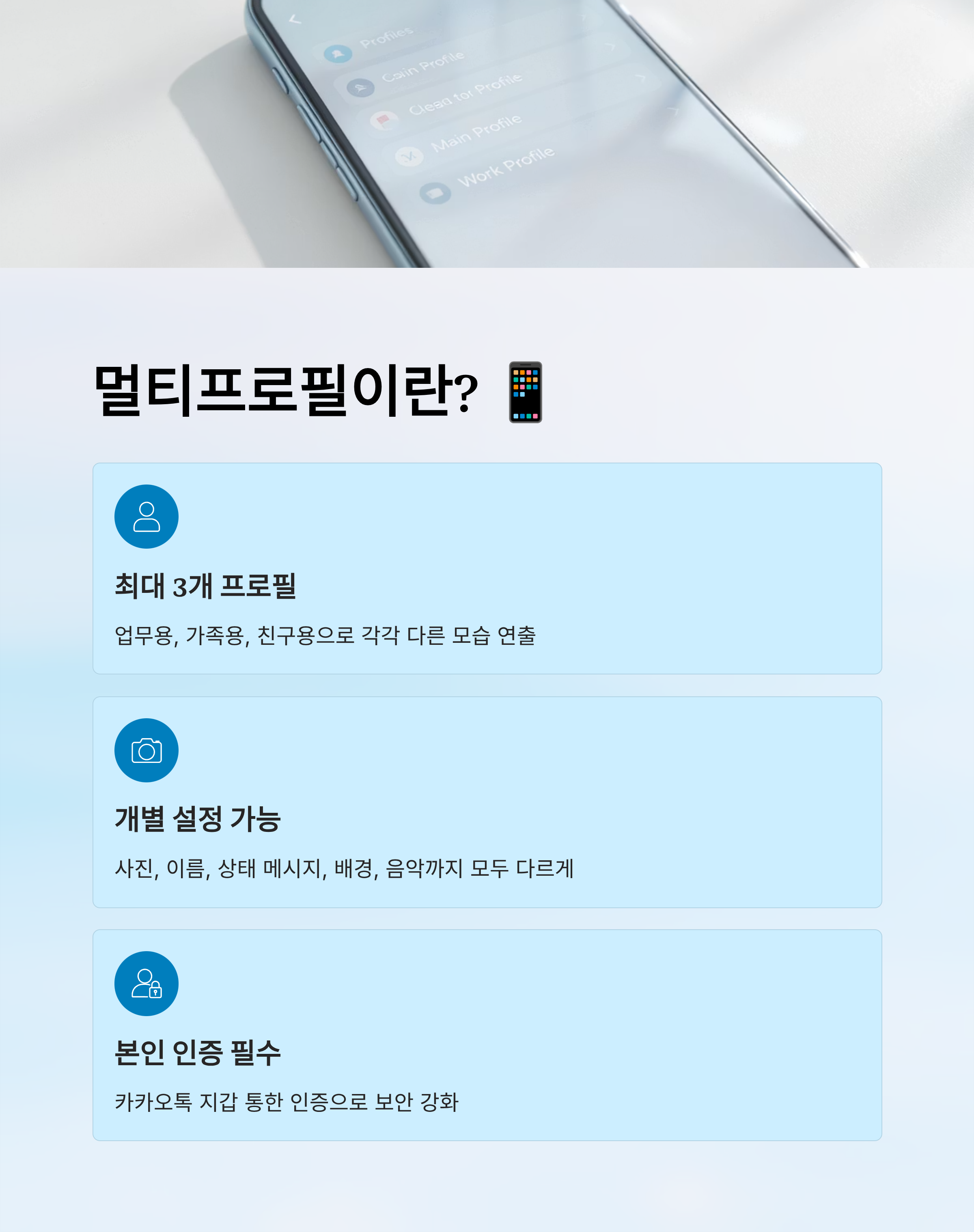 카카오톡 멀티프로필은 한 계정에서 최대 3개의 프로필을 만들어 친구마다 다르게 보여줄 수 있는 기능이에요. 사진, 이름, 상태 메시지, 배경까지 개별 설정이 가능해서 업무용, 가족용, 친구용으로 다양하게 활용되죠.