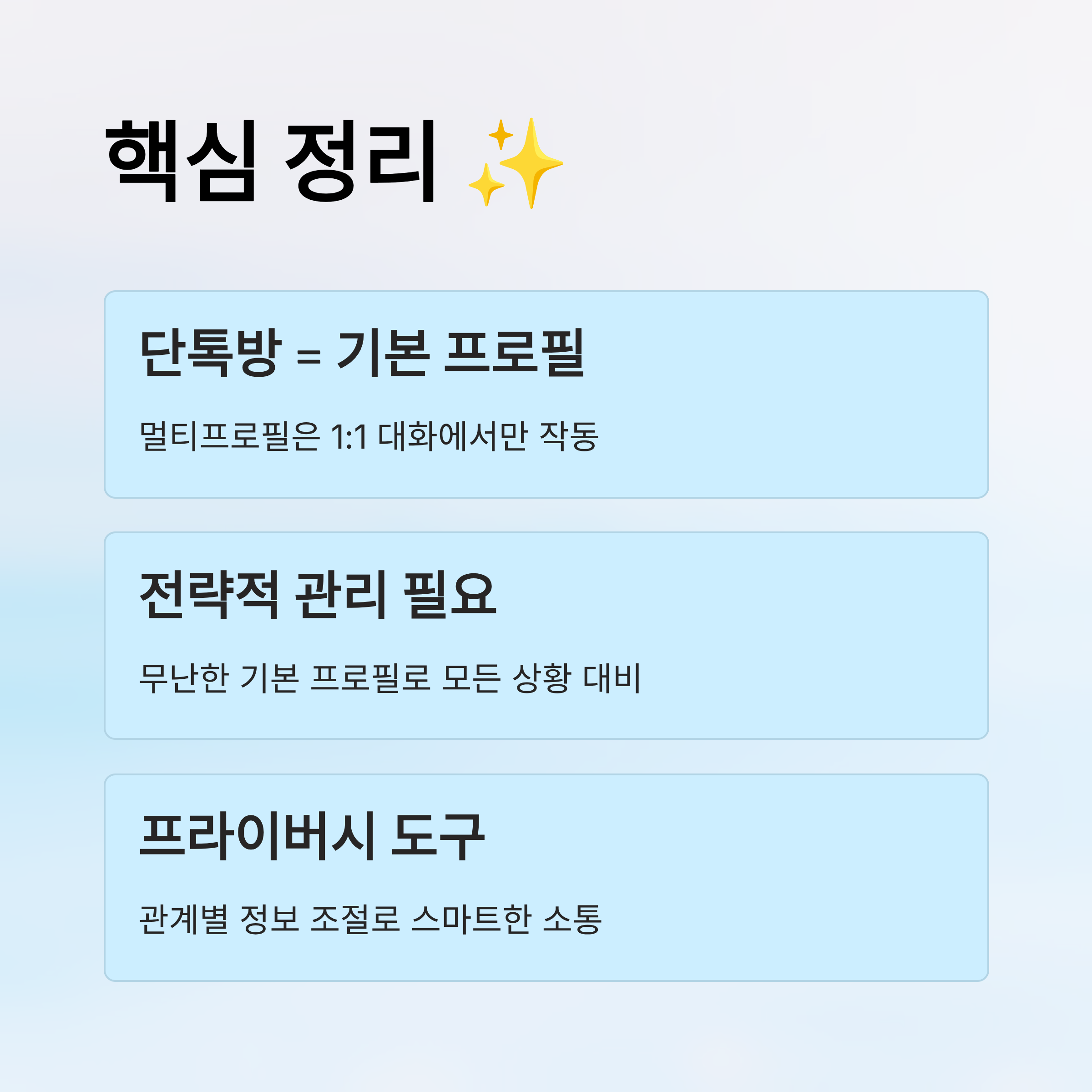 이렇게 표로 보면 멀티프로필의 유용함이 확실히 느껴지죠? 각각의 프로필을 통해 내가 원하는 이미지와 메시지를 명확하게 전달할 수 있어요. 특히 요즘처럼 관계별로 거리감이나 표현 방식이 중요한 시대에는 정말 유용한 기능이에요. 👍