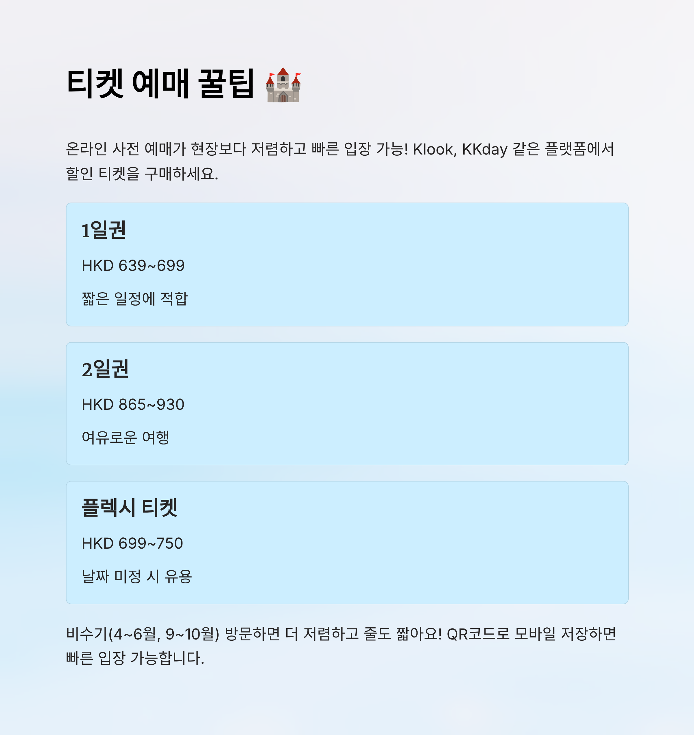 | 1일권 | 기본 입장, 하루 이용 | HKD 639~699 | 짧은 일정 | 지정 날짜 |