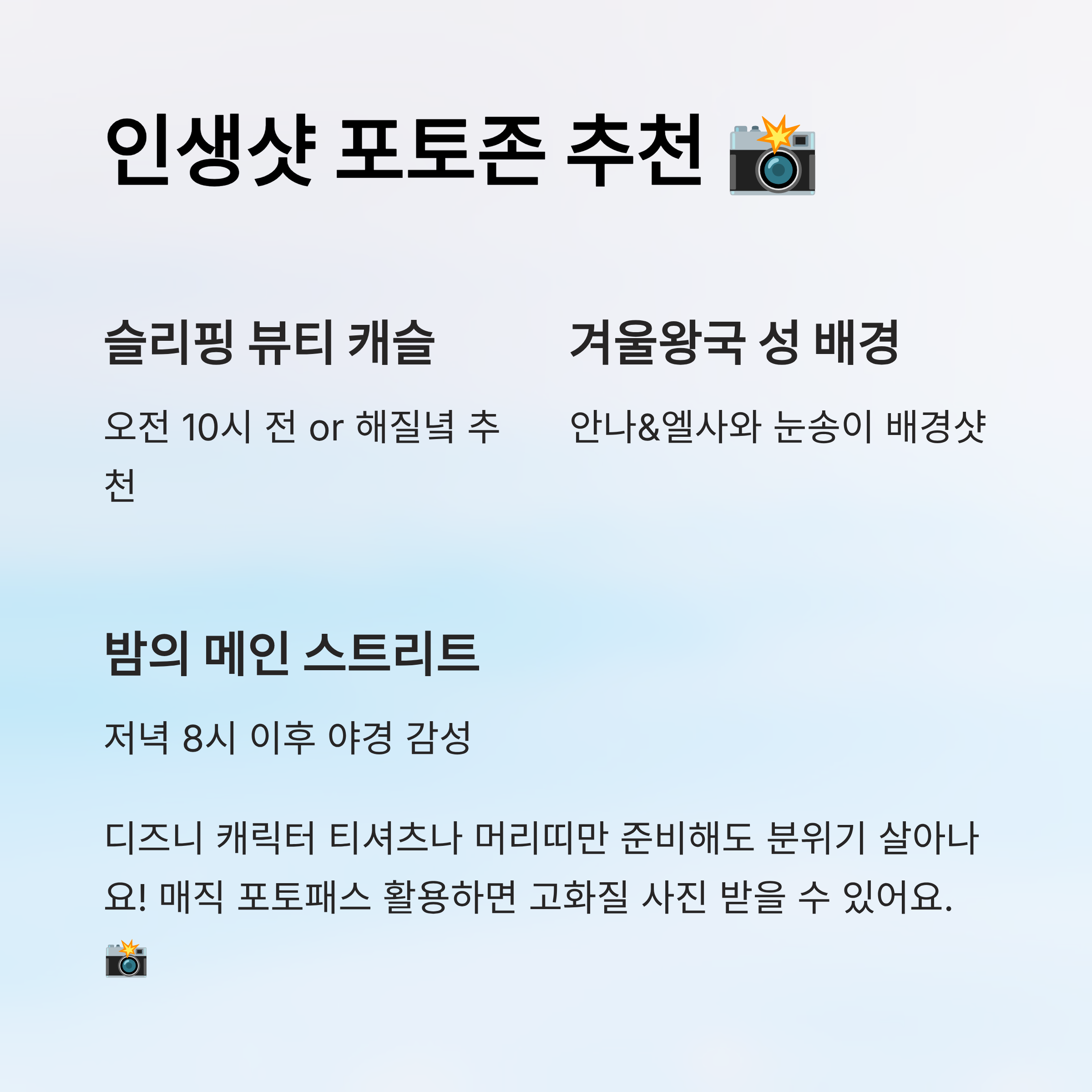 | 슬리핑 뷰티 캐슬 | 디즈니 감성 메인샷 | 오전 9시~10시 | 전면샷 & 광각 추천 |
