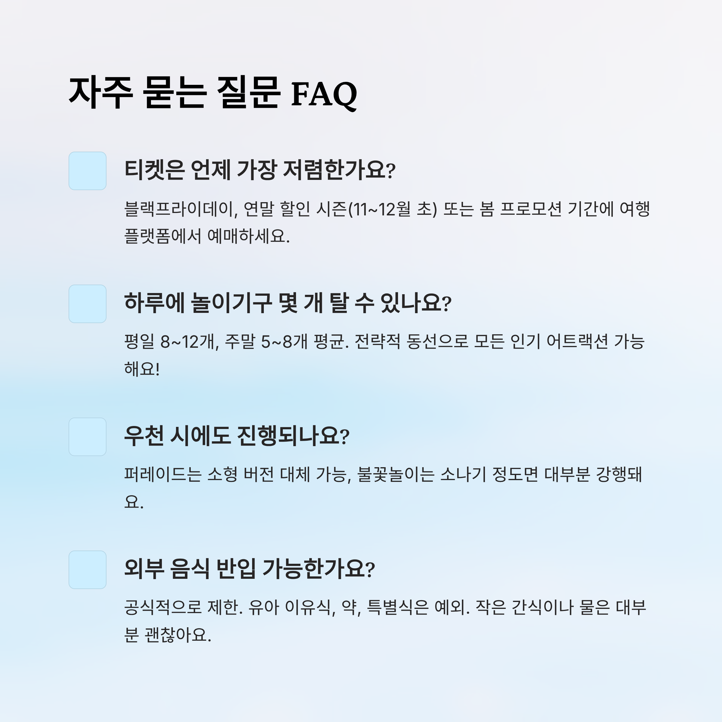 A1. 여행 플랫폼(Klook, KKday 등)에서 연중 진행하는 프로모션 기간이나 블랙프라이데이, 연말 할인 시즌(11월~12월 초)에 예매하는 것이 가장 저렴해요. 2025년 기준으로는 봄 프로모션도 놓치지 마세요!