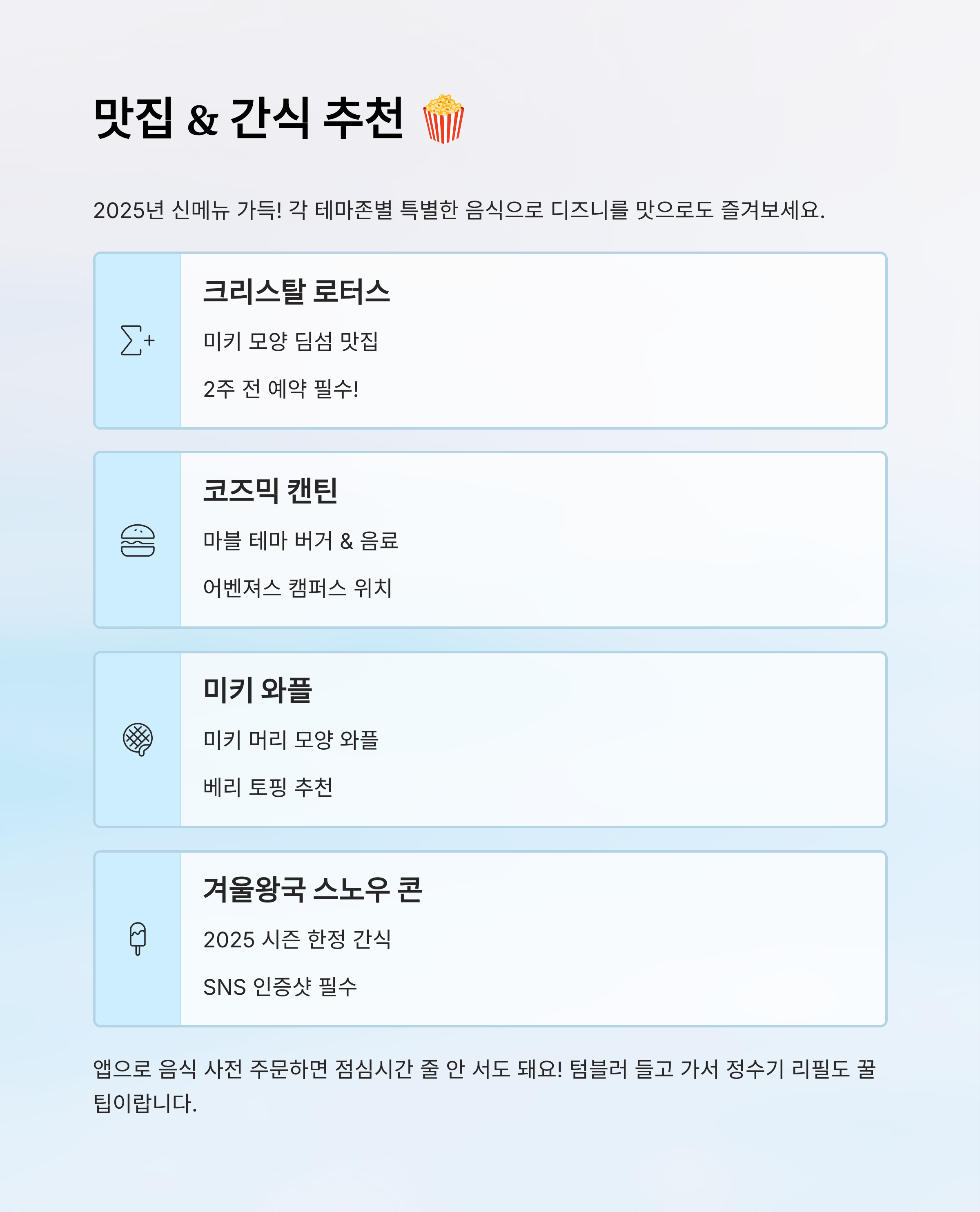 빠르게 간식이 당길 땐 파크 안 곳곳에 있는 푸드카트에서 미키 머리 모양 와플, 디즈니 팝콘 버킷, 스티치 아이스크림 등을 사 먹을 수 있어요. 특히 2025년에는 ‘겨울왕국 스노우 콘’과 ‘마블 히어로 드링크’ 같은 시즌 한정 간식이 인기랍니다.