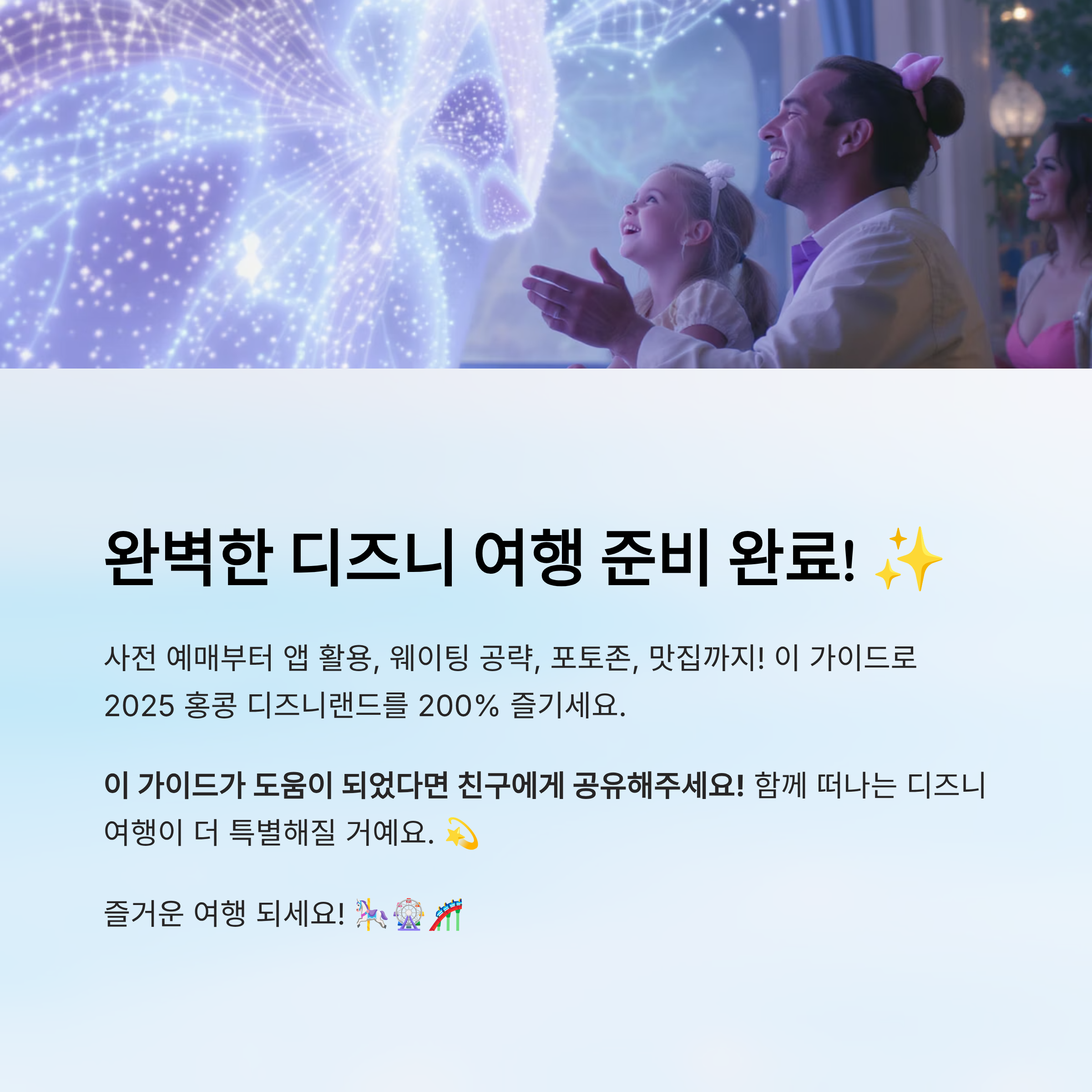 내가 생각했을 때 가장 중요한 건, 사전 준비예요. 티켓부터 입장 시간, 어트랙션 동선, 퍼레이드 시간까지 한눈에 파악하고 계획해야 실패 없는 하루를 보낼 수 있어요. 이 글 하나만 보면 2025년 홍콩 디즈니랜드 완전 정복, 어렵지 않아요!