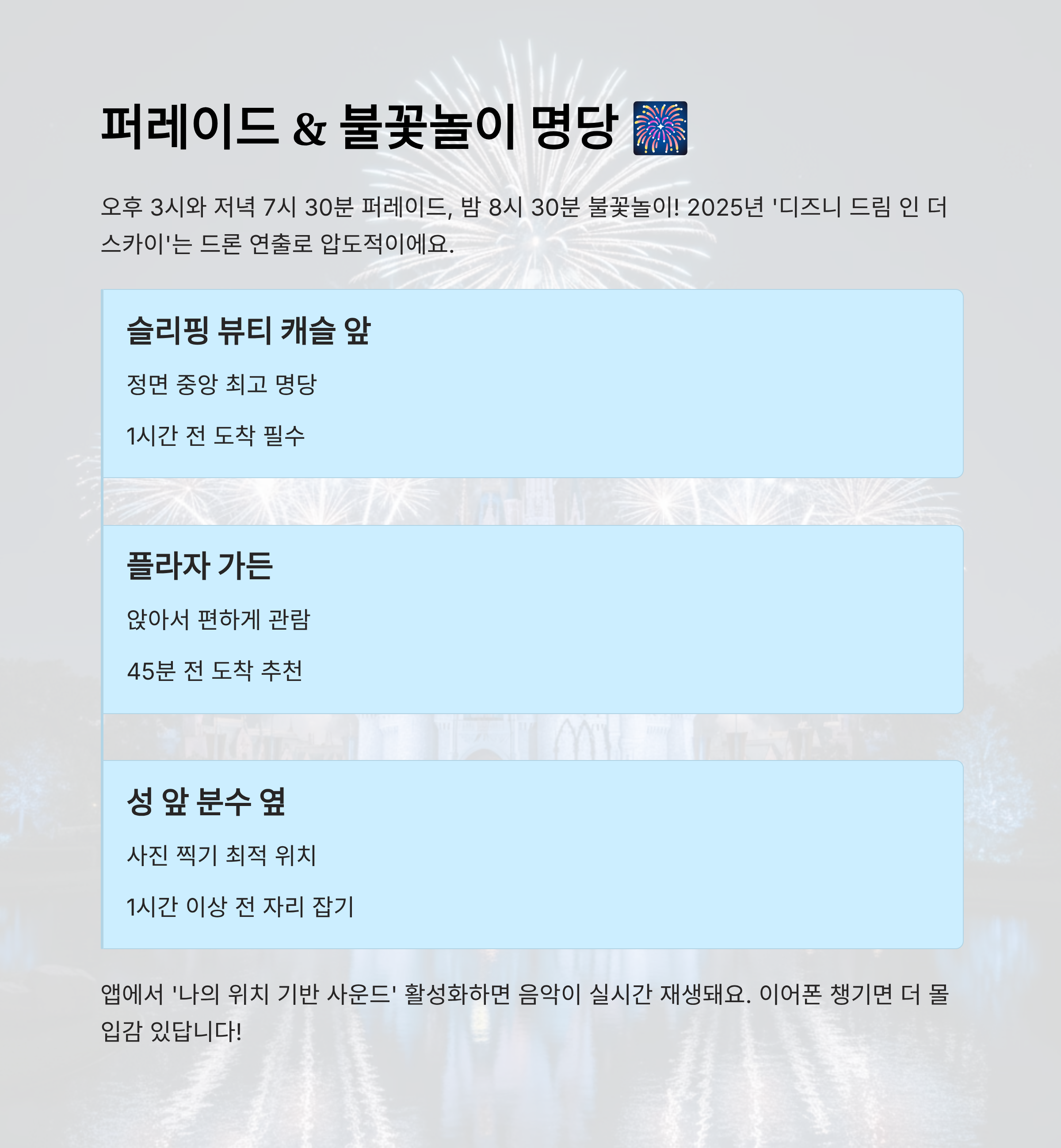 | 명당 위치 | 설명 | 추천 시간 | 퍼레이드/불꽃놀이 |