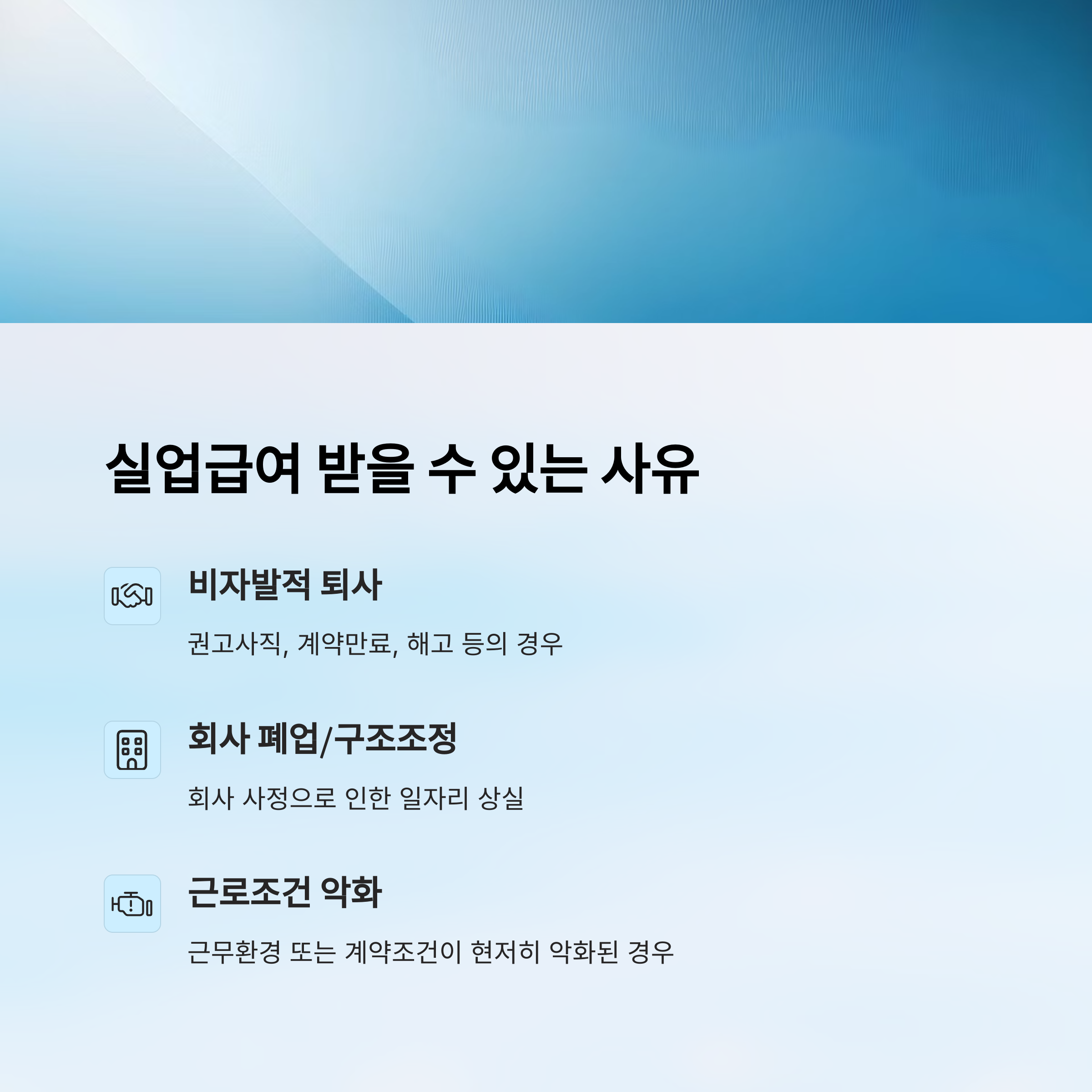 회사의 사정으로 인해 퇴사한 경우, 실업급여를 받을 수 있는 경우와 받을 수 없는 경우가 있어요. 핵심은 "비자발적 퇴사"로 인정되는지 여부예요.