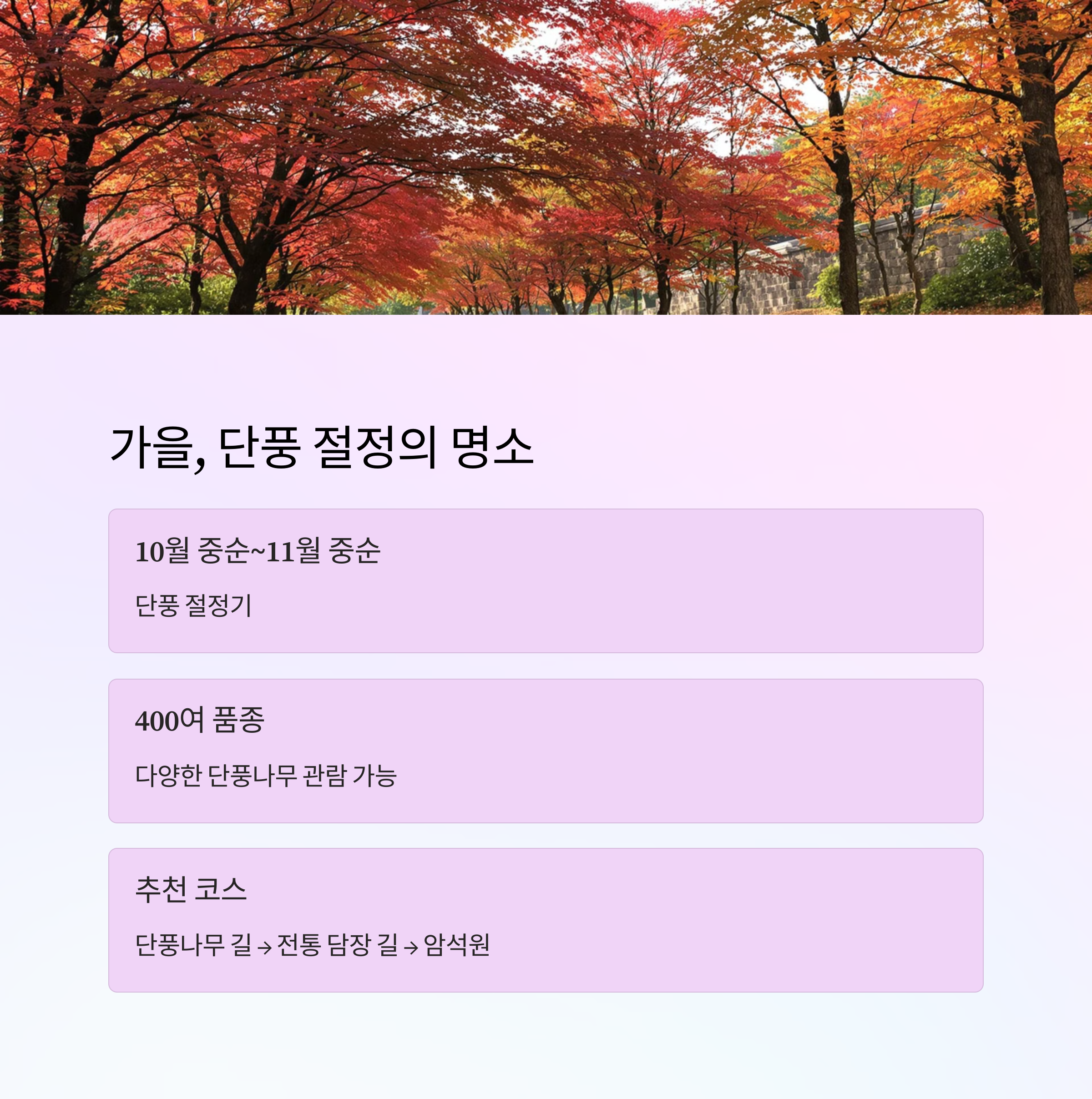 | 단풍나무길 | 붉은 단풍이 절정을 이루는 대표 명소 | 10월 중순~11월 초 |