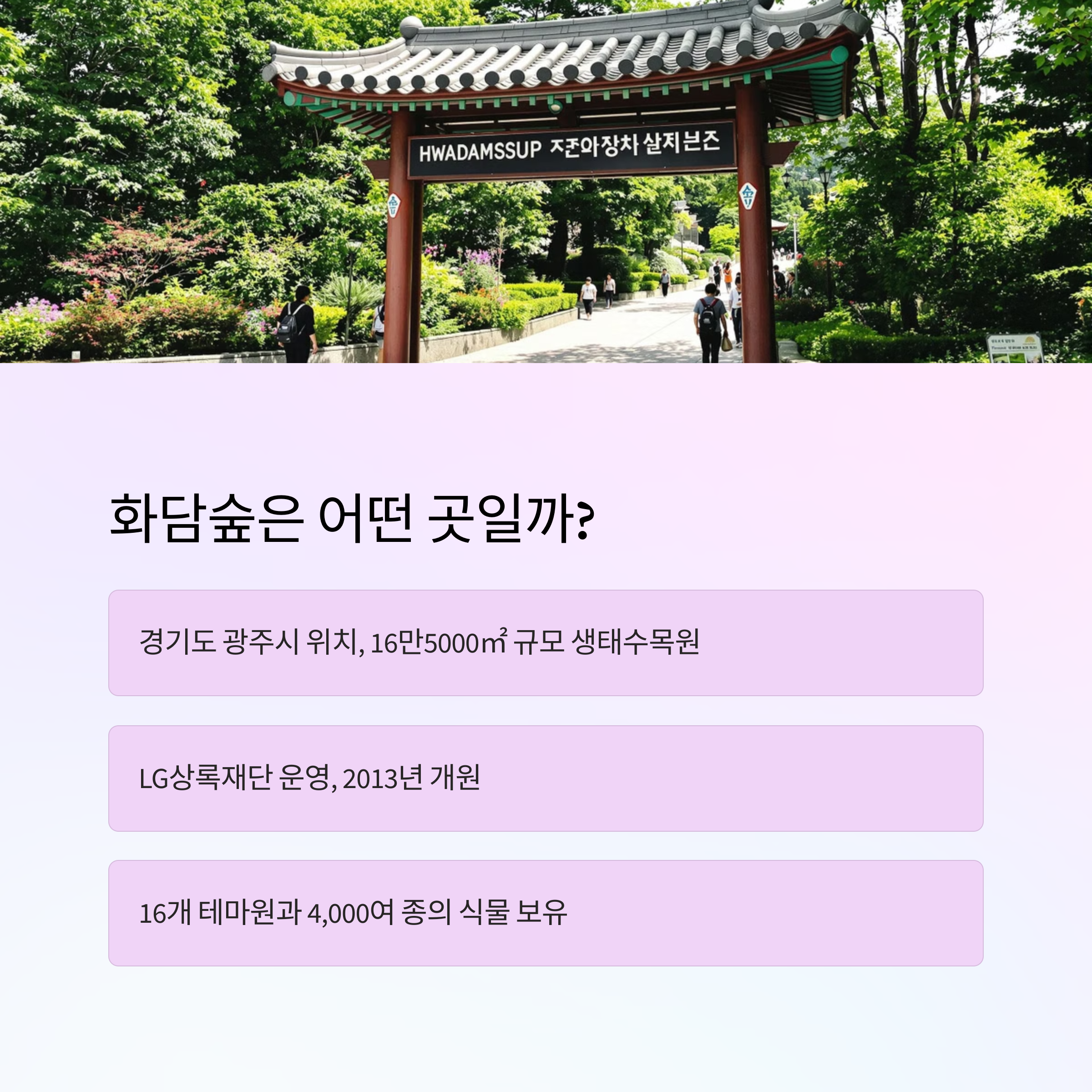 - 📝 **사전 예약 필수!** – 화담숲은 100% 사전 예약제로 운영돼요. 방문 전에 공식 홈페이지에서 예약하세요!