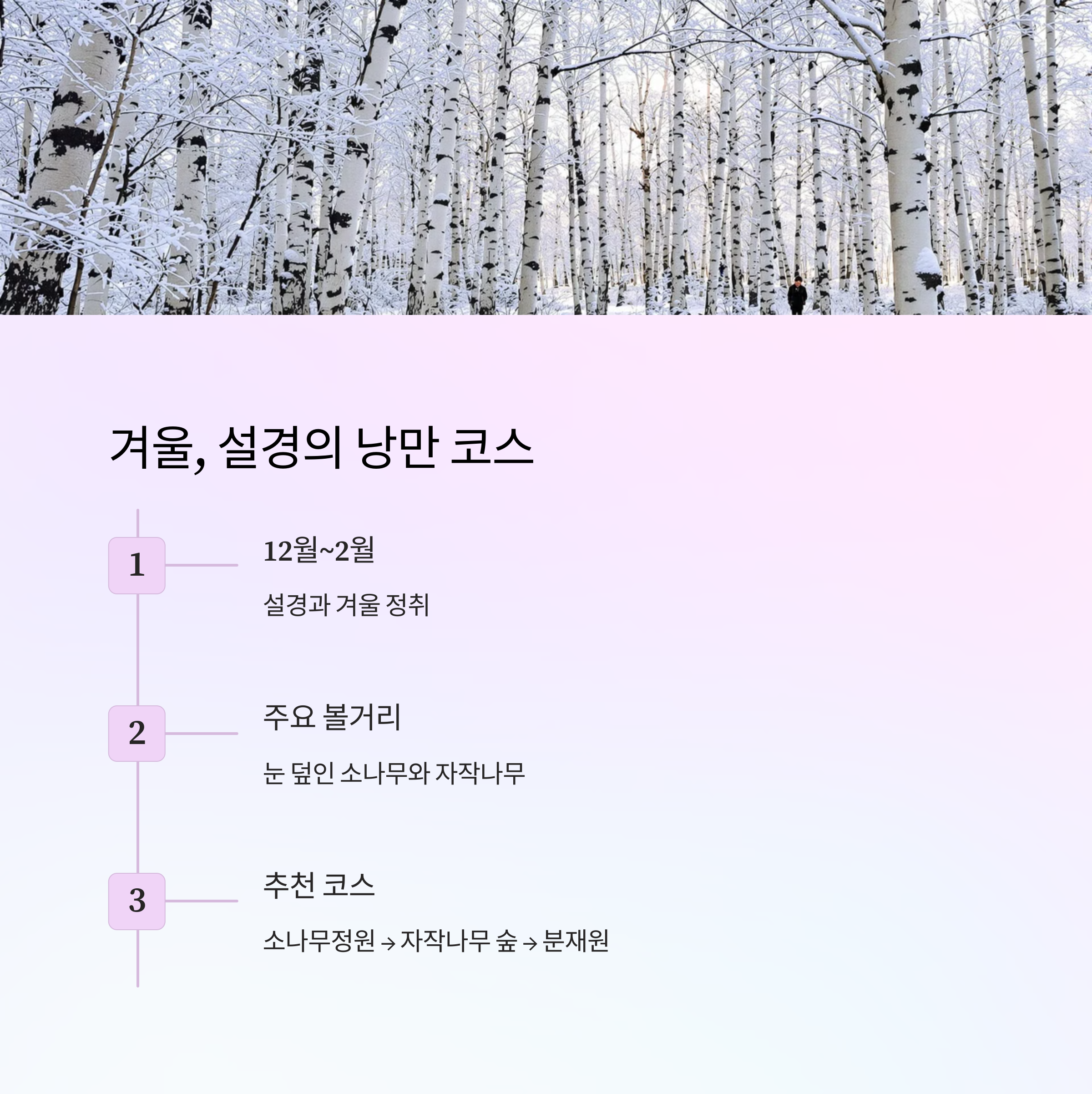 | 설경 포토존 | 눈 덮인 숲을 배경으로 감성 사진 가능 | 12월~2월 |
