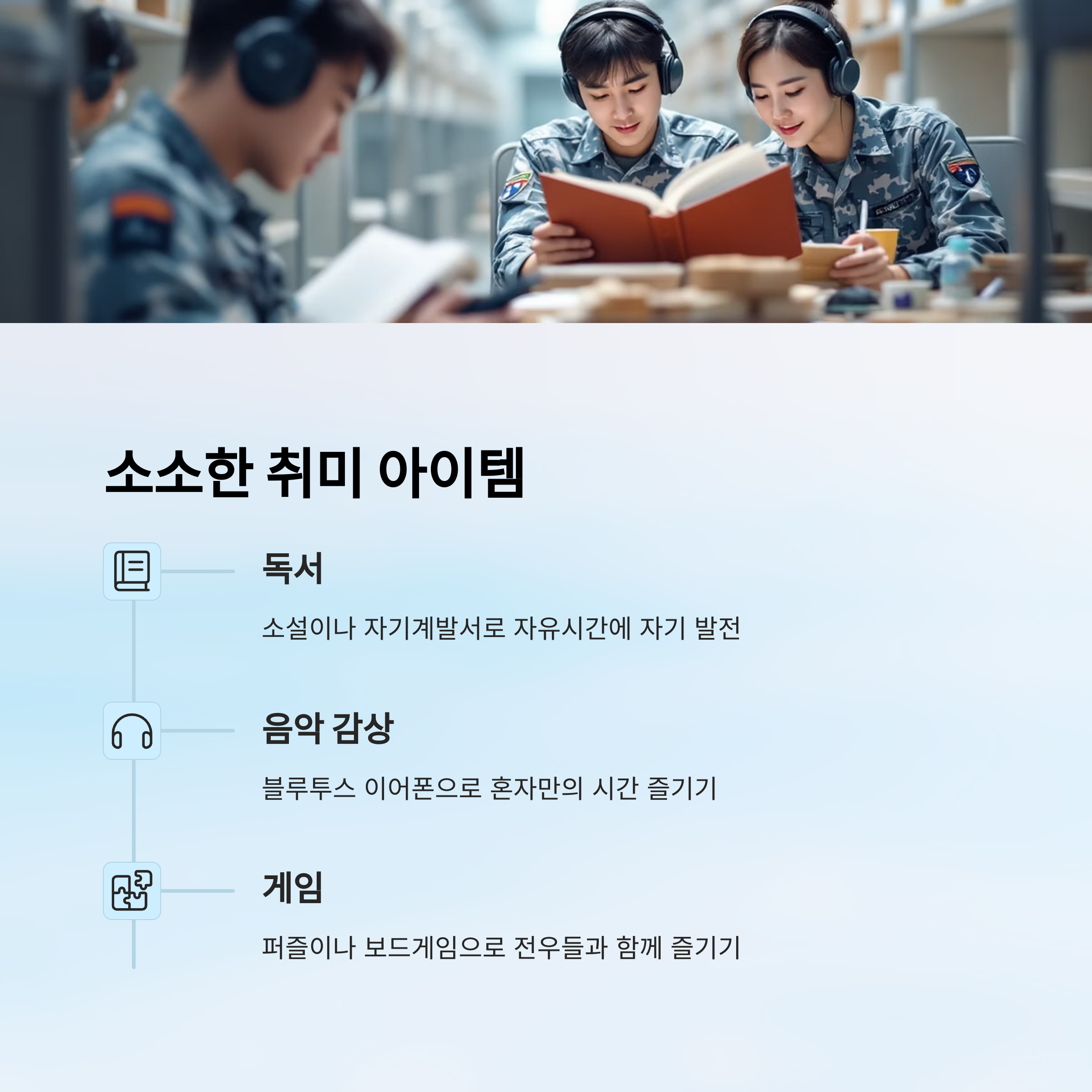군대에서도 소소한 취미를 즐기면서 시간을 보내면 스트레스 해소에 큰 도움이 돼요! 🎵📖
