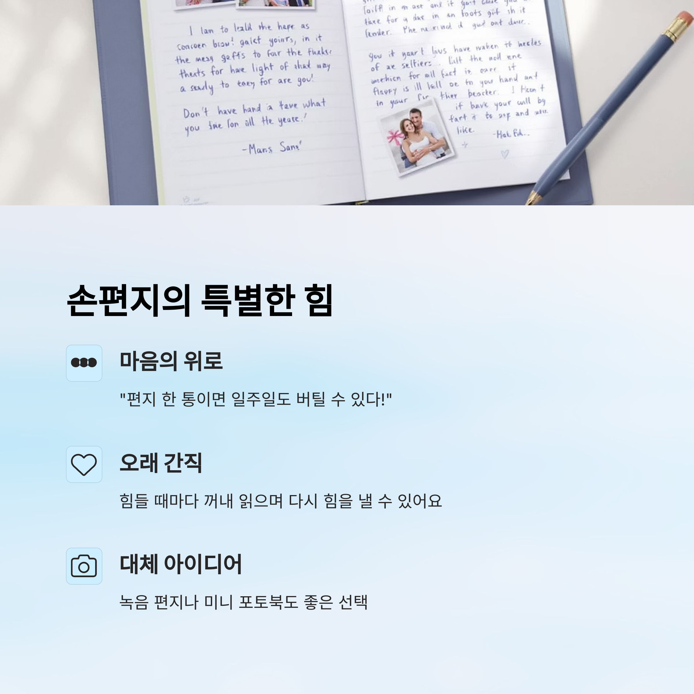 | 정성스러운 손편지 | 직접 쓴 편지는 무엇보다 감동적이에요. |