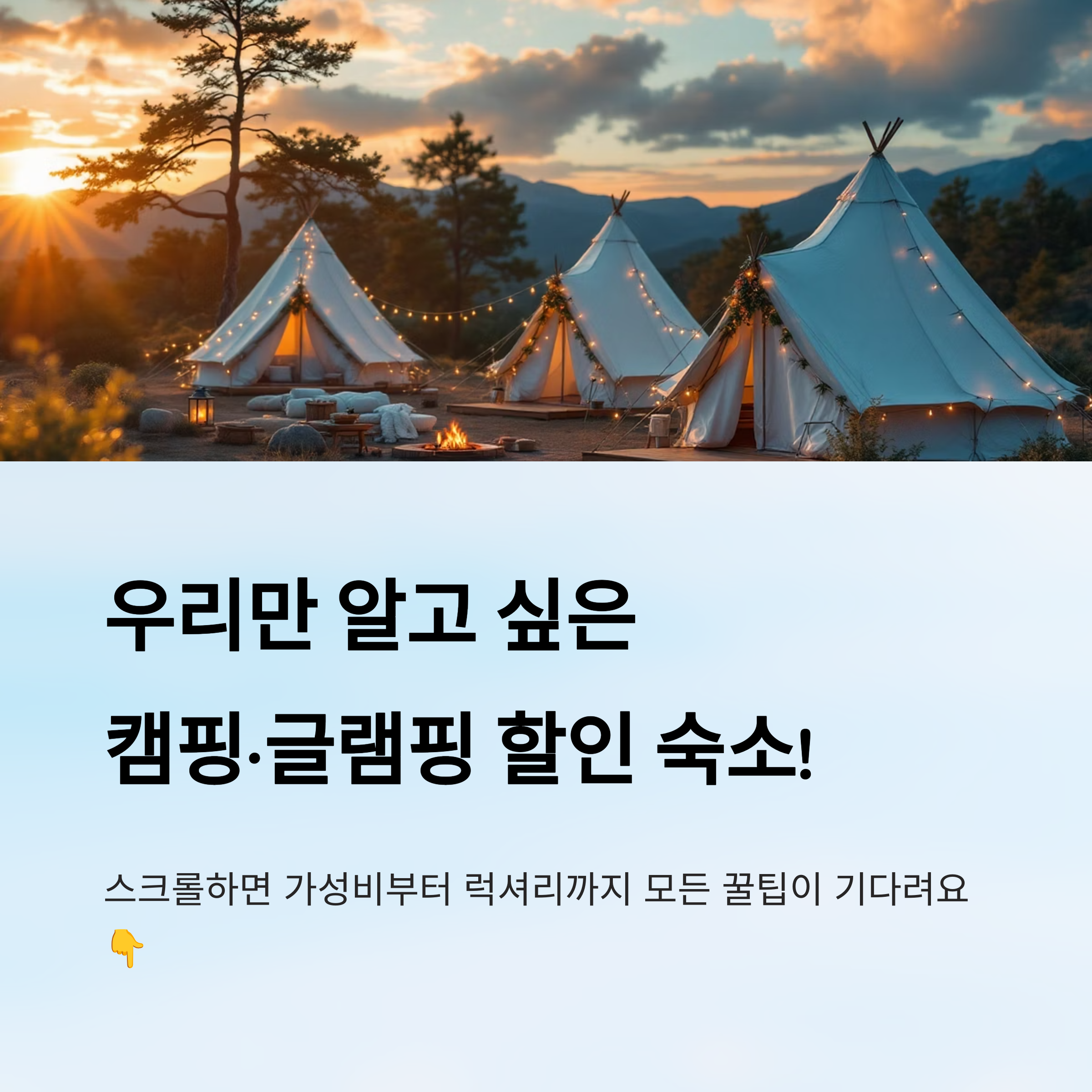 안녕하세요! 🏕️ 이번에는 캠핑과 글램핑을 좋아하는 분들을 위한 할인 숙소 모음을 소개할게요. 자연 속에서 즐기는 감성 가득한 캠핑과 편안하게 즐길 수 있는 럭셔리 글램핑까지, 다양한 스타일의 캠핑 숙소를 추천해 드릴게요.