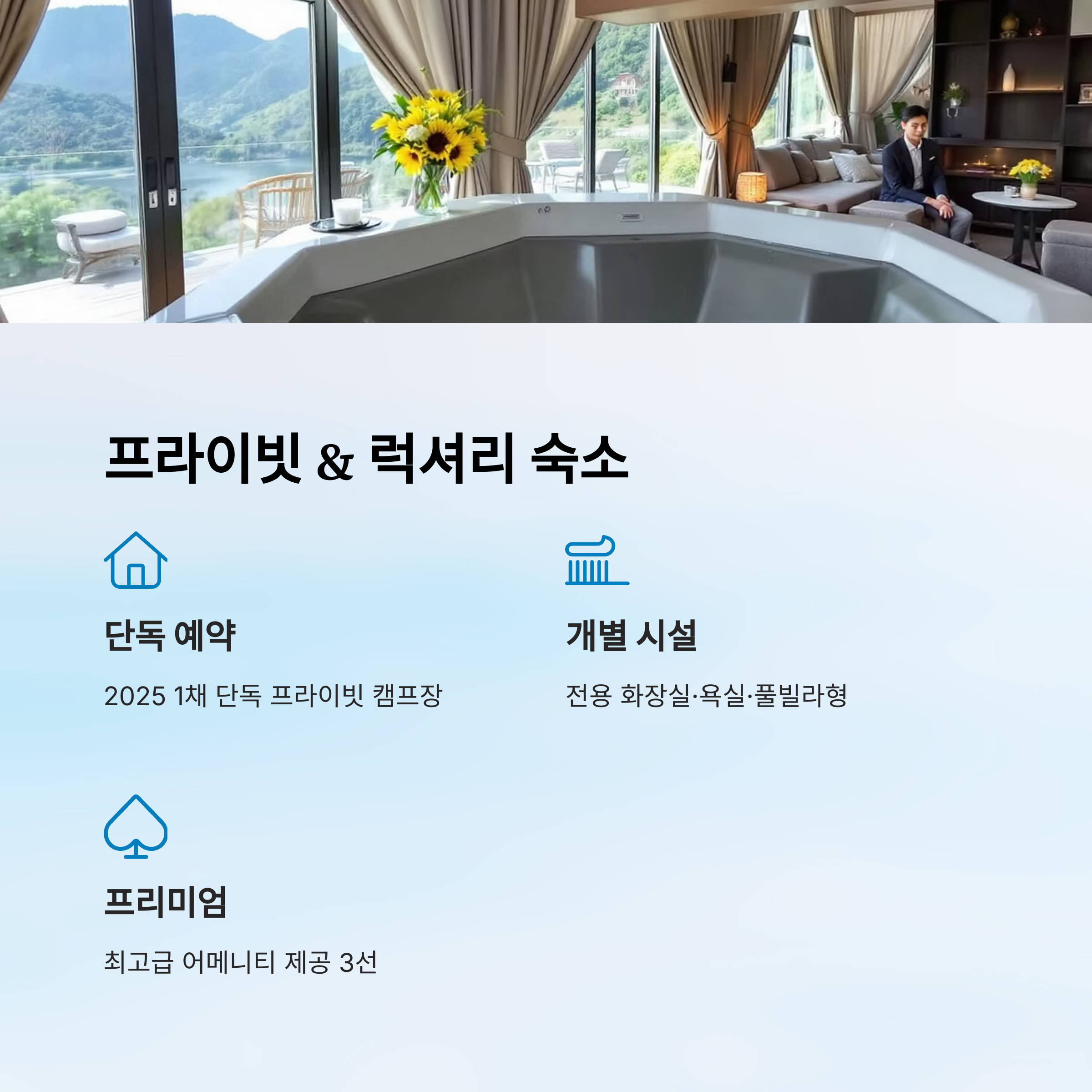 | 프라이빗 캠핑빌 | 경남 남해 | 독립 사이트, 개인 수영장 | 가족·연인 추천, 럭셔리 캠핑 |