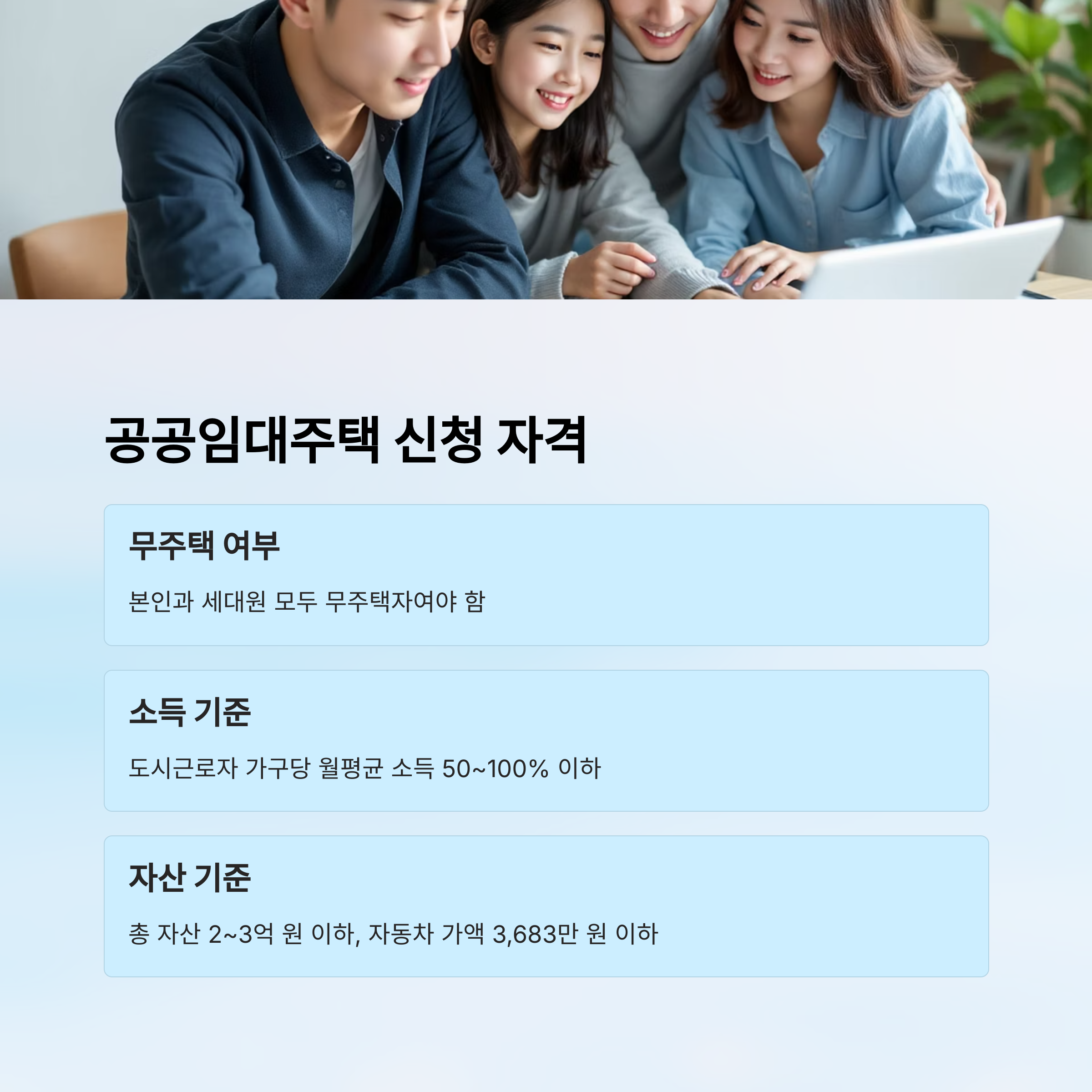 🏠 공공임대주택을 신청하려면 **소득, 자산, 무주택 여부 등** 여러 조건을 충족해야 해요. 특히 **주택 유형에 따라 신청 기준이 다르므로 본인의 상황에 맞게 확인**하는 것이 중요해요! ✅