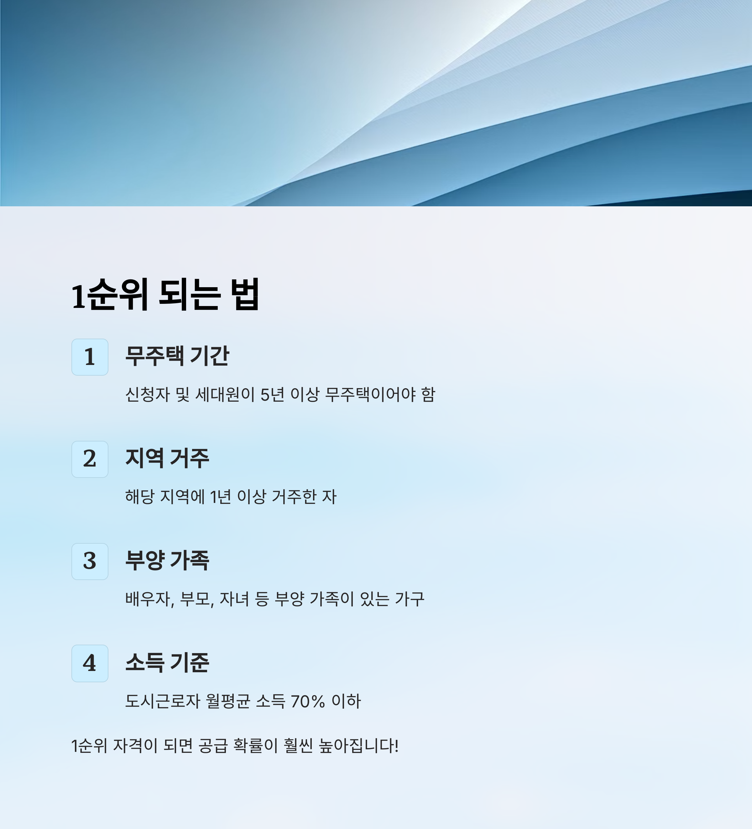 🏠 공공임대주택은 **경쟁률이 높기 때문에 1순위 자격**을 갖추는 것이 중요해요. 1순위가 되면 **청약 당첨 확률이 높아지고, 우선 공급 대상이 될 가능성**이 커져요! ✅